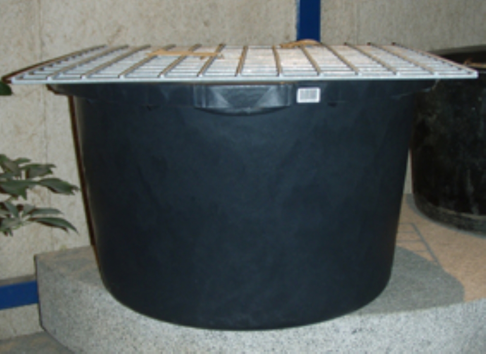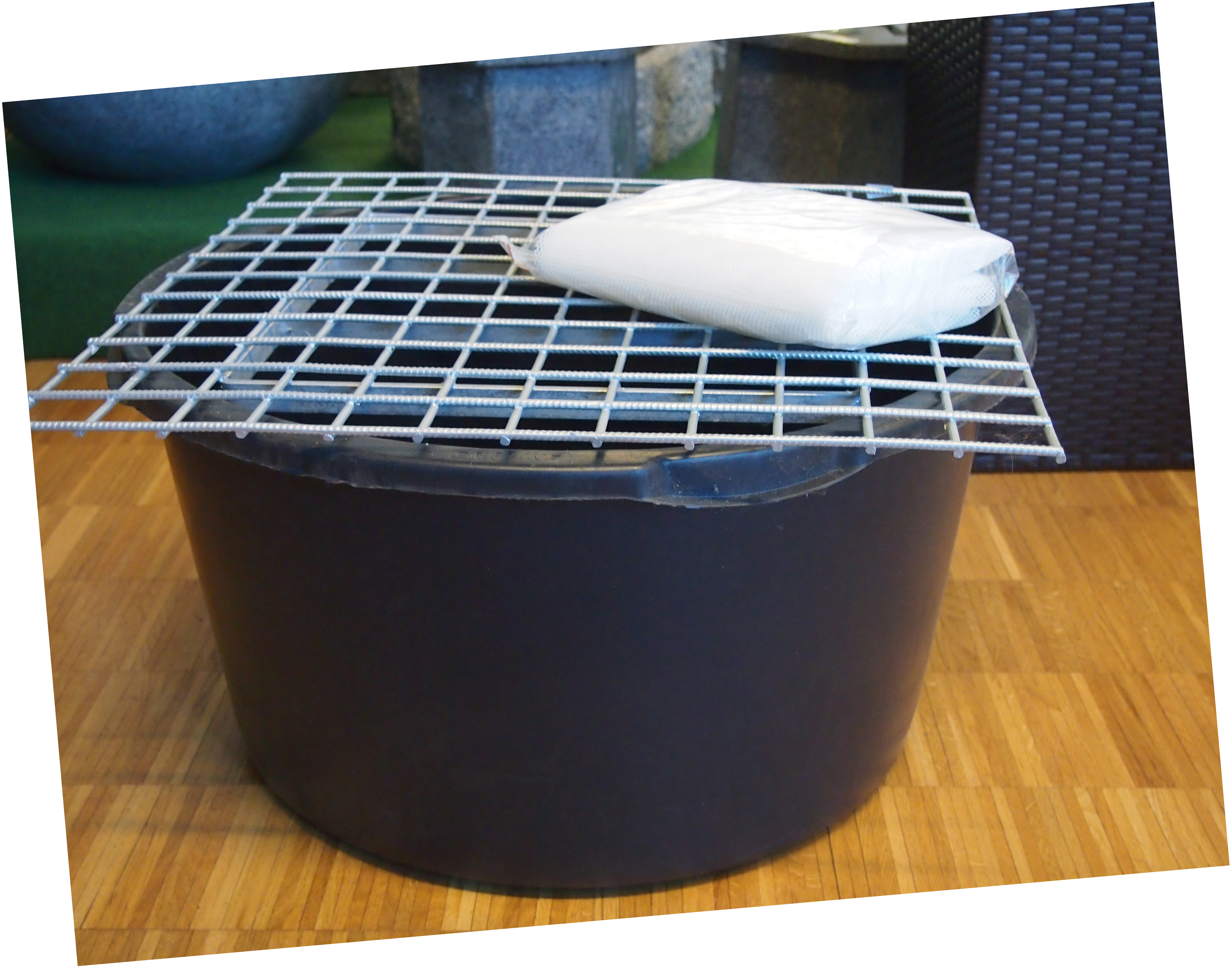 PVC balje med galvaniseret gitter og 1x1 meter plastvæv. Baljen har en diameter på 65 cm. Denne balje er yderst velegnet til etablering af vandmiljø i haven. Baljen nedgraves til kanten. Herpå lægges gitteret. Dernæst lægges plastvævet ud over for at forhindre blade, sand og småsten i at havne i vandet. Placér dernæst pumpen i baljen og montér slangen. Hæv gerne pumpen lidt op fra bunden med en lille flisestump eller lignende. Det forlænger pumpens levetid. Skær et lille hul i midten af plastvævet til at føre slangen op igennem. Så er det tid til at få din vandsten på plads. Før derefter slangen op gennem vandstenen nedefra. Når du har fat i slangen i toppen af vandstenen, sætter du den lille sorte gummipakning omkring slangen. Herefter putter du stille og roligt pakningen ned i hullet på vandstenen, så vandet ikke kan løbe tilbage gennem hullet. Så er du klar til at fylde baljen med vand for derefter at tilslutte pumpen til strøm. Nu kan du dekorere dit vandmiljø med strandsten eller andre småsten.