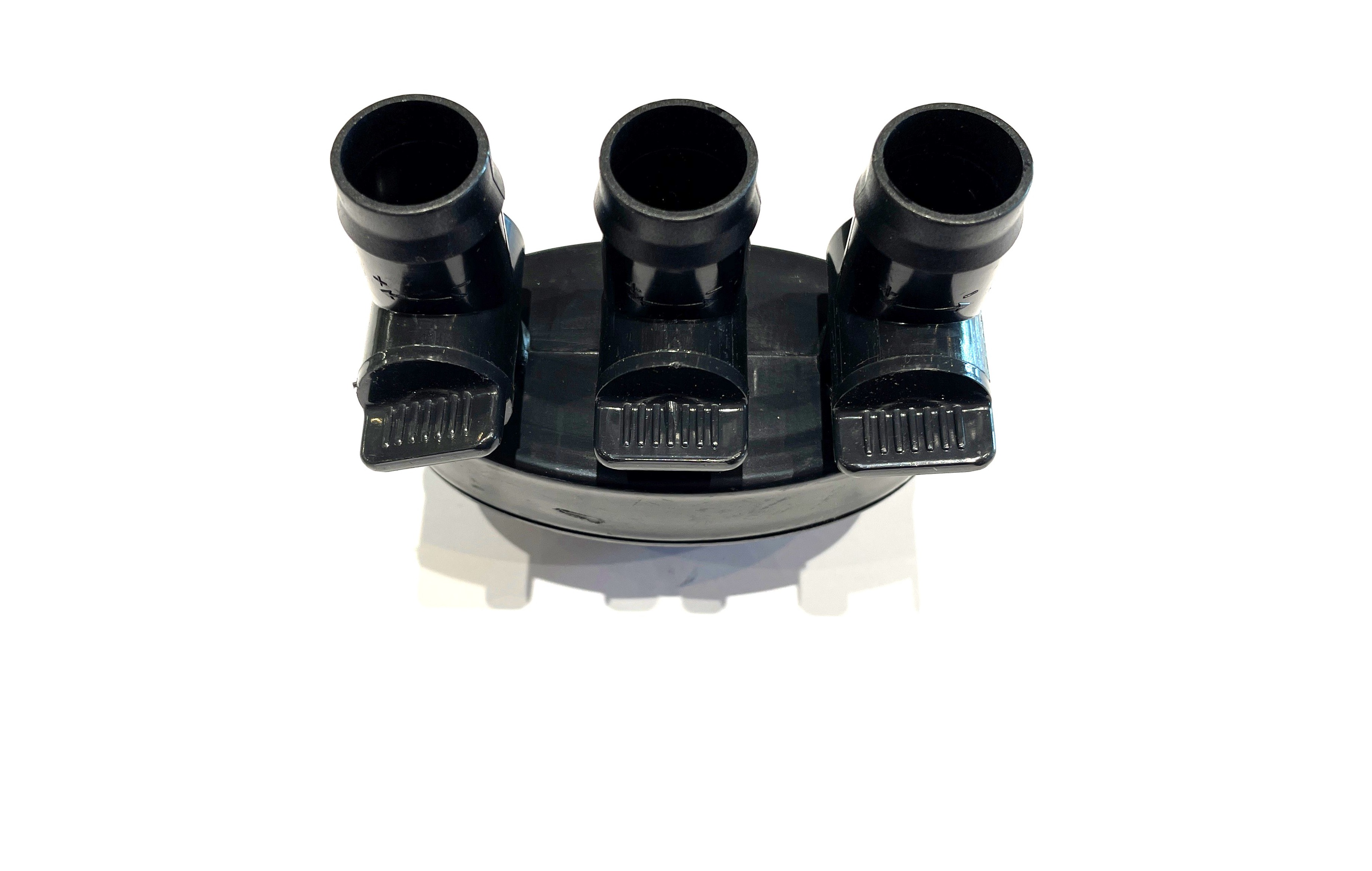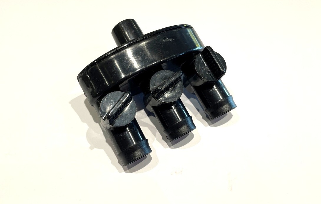 Slangestuds med mulighed for 3 udgange. Mulighed for regulering/lukning på alle 3 udgange. De 3 udgange passer til størrer slanger. Anvendes til eksempelvis 3 vandsten der er koblet på samme pumpe. Små studser medfølger ikke - derfor nedsat i pris!