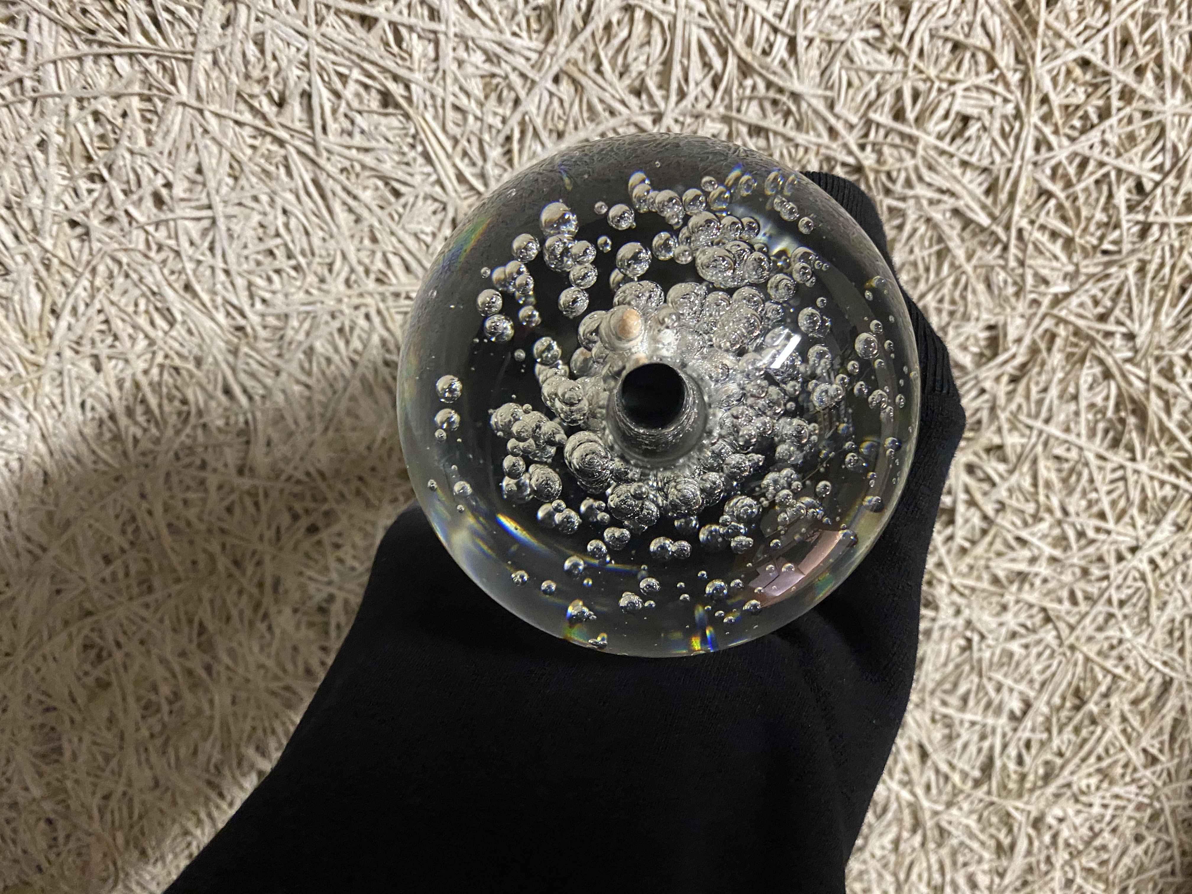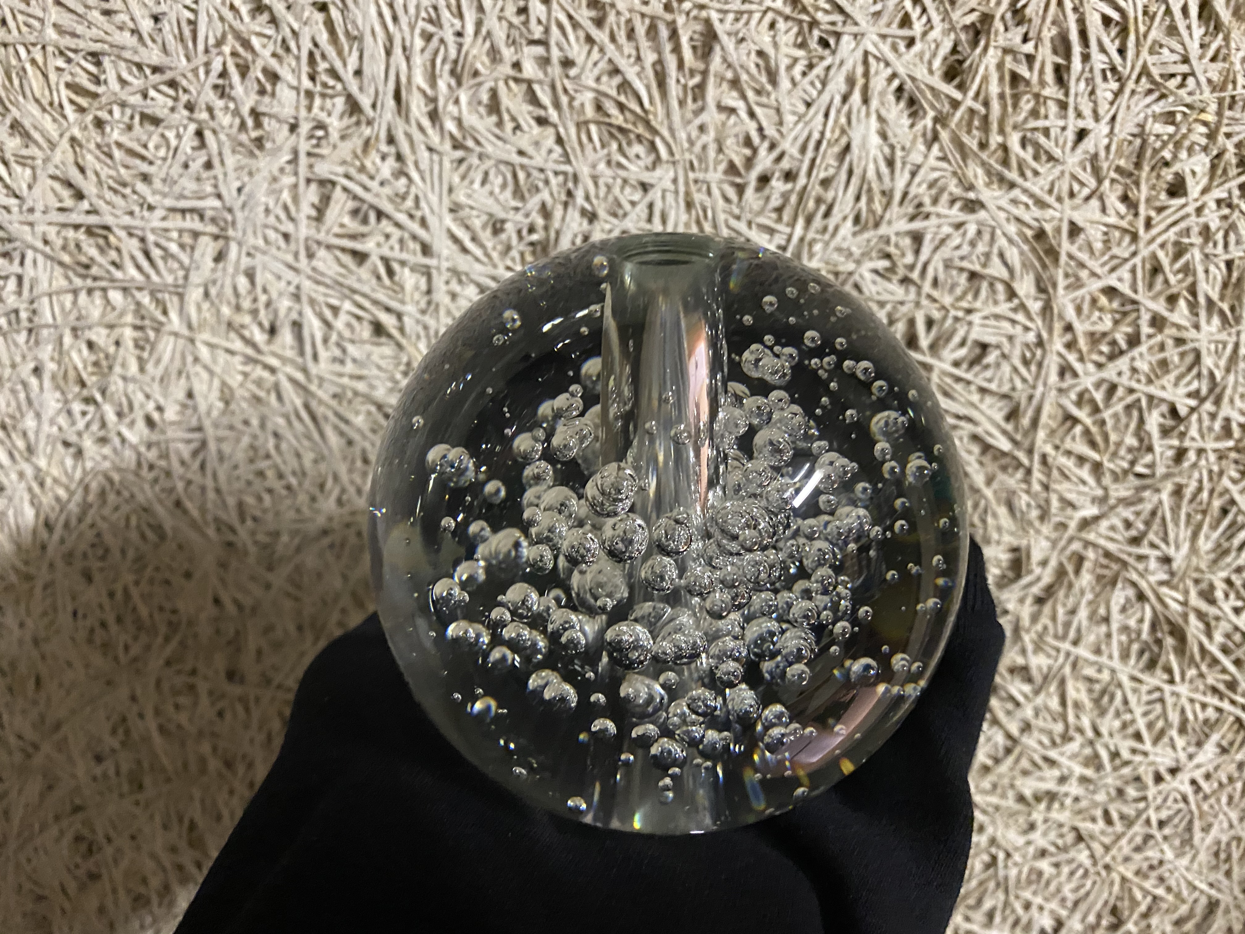 Glaskugle på 9-10 cm i diameter. Kuglen har hul i midten så den kan bruges vil vandmiljøer hvor vandet kommer op og løber ned over kuglen. Luftboblerne inde i kuglen variere fra kugle til kugle