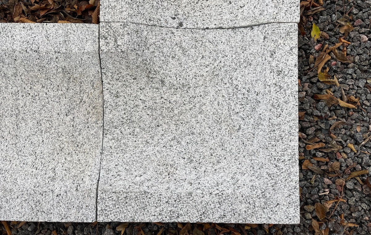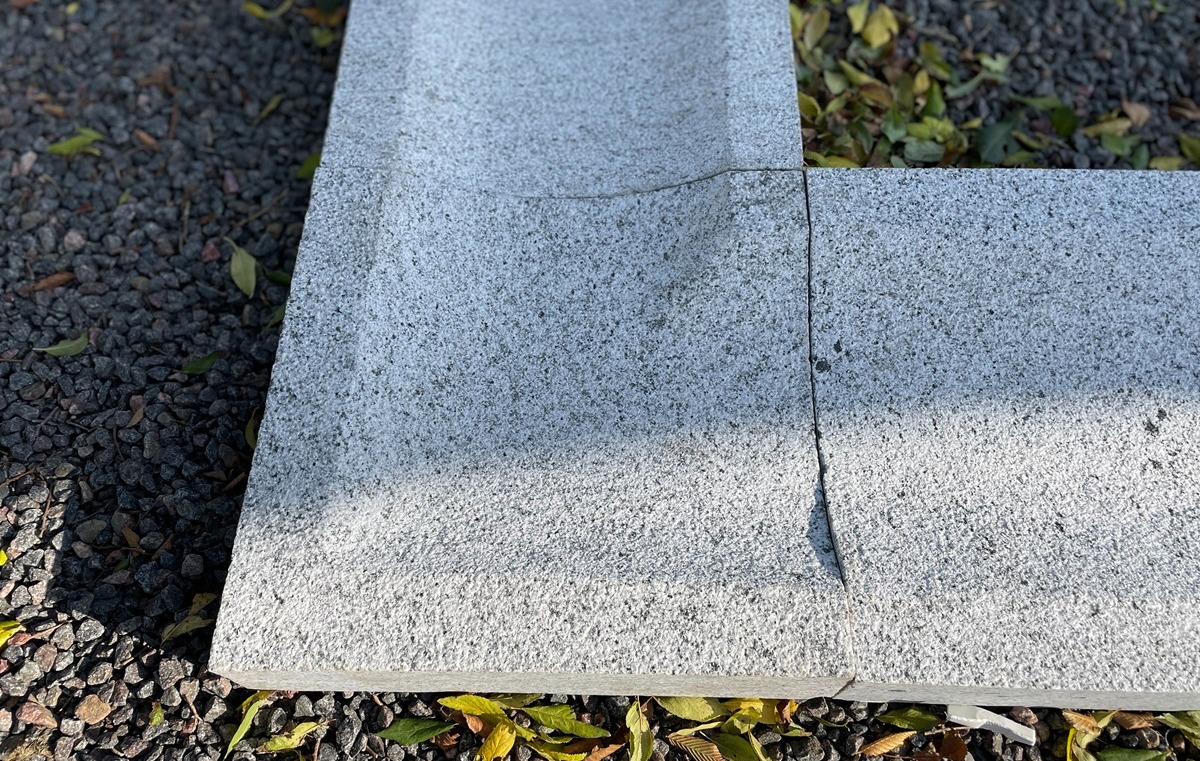 Vandrende i grå indisk granit. Denne vandrende er et hjørnestykke, og har til formål at skabe en vinkel/hjørne til lige stykker vandrender. En vandrende har mange formål og anvendes ofte som dekorativt element i haver, parker og offentlige områder.