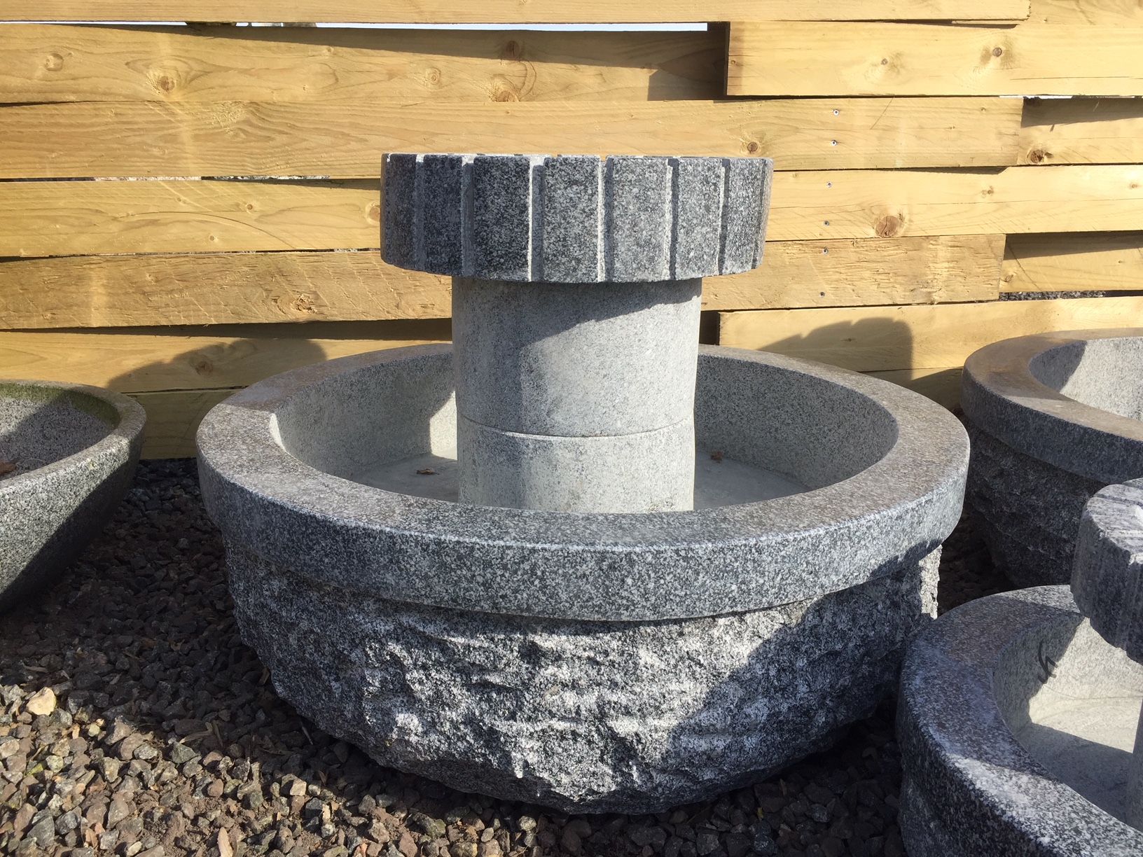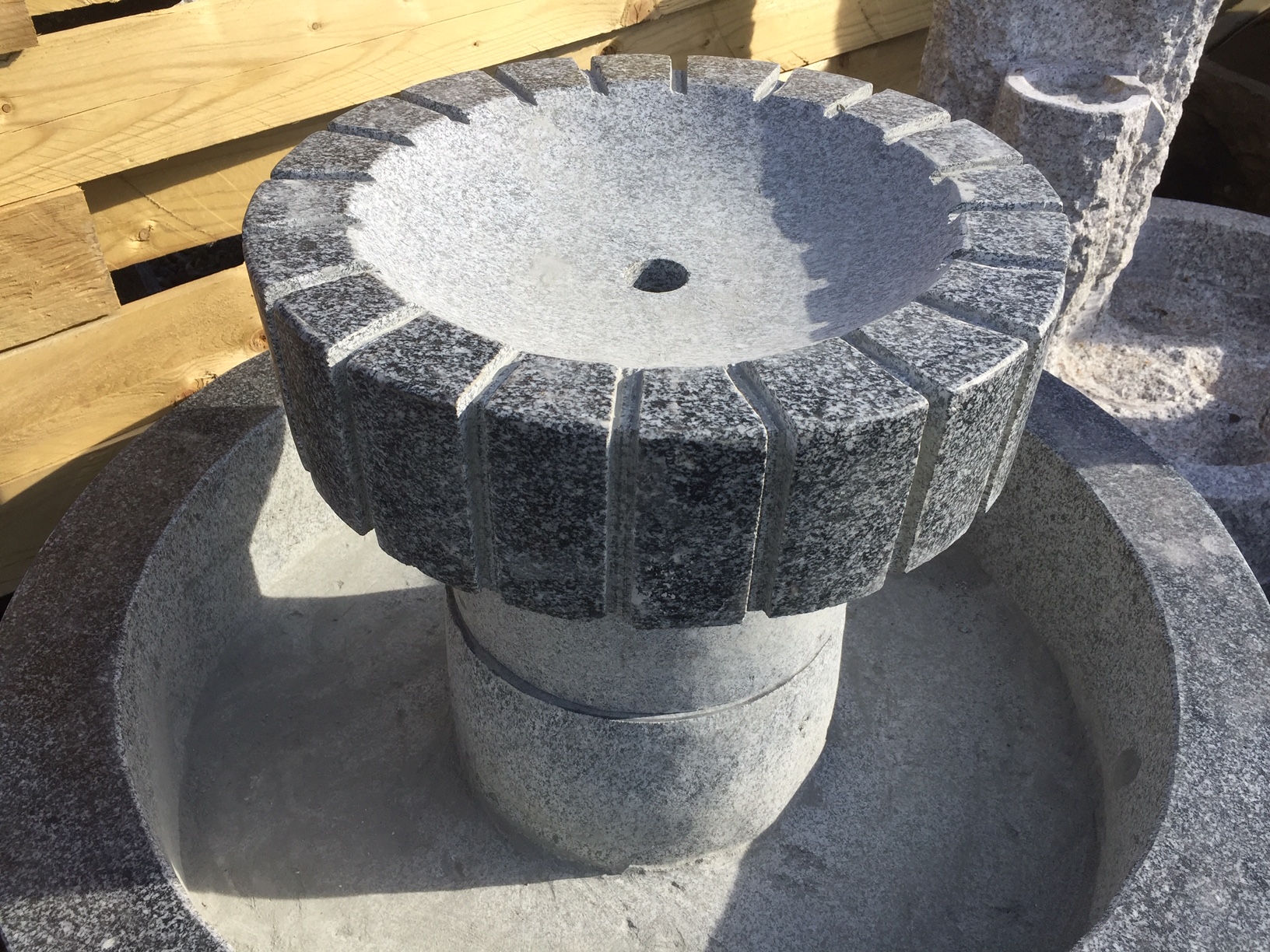 Et komplet vandreservoir i grå granit med springvandseffekt. Vandstrålen i vandstenens midte løfter sig i en lille blå LEDring, og vandet løber ud over fontænen og opsamles i karret. Det er ganske dekorativt og frembringer den karakteristiske og for mange beroligende lyd af rislende vand.