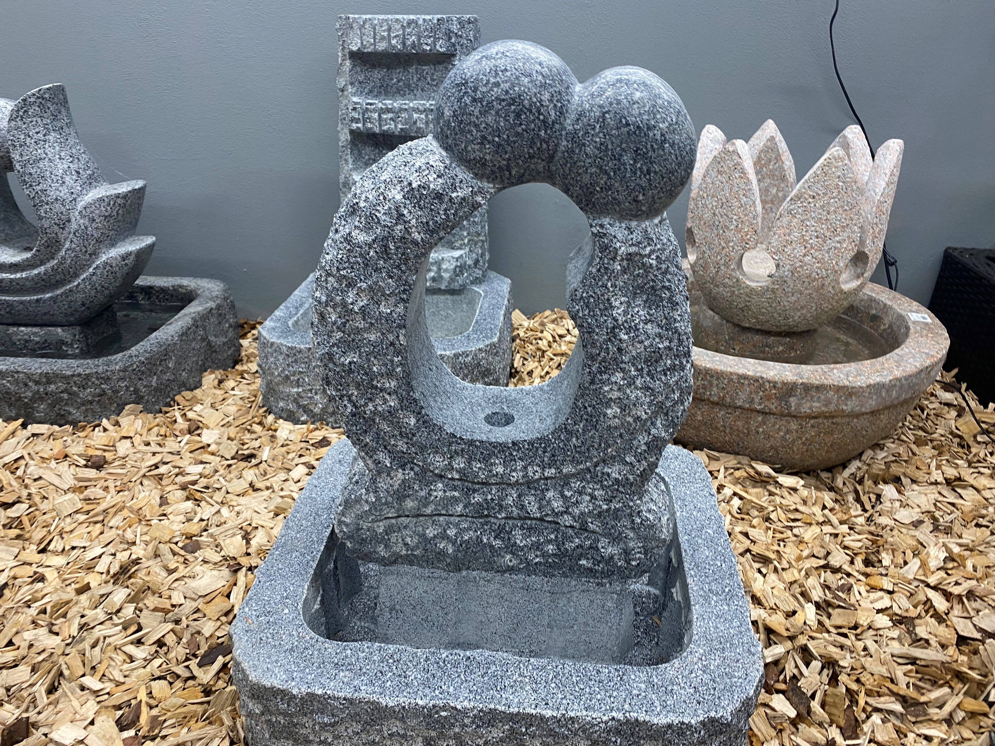 Vandstenen er komplet med pumpe, som ligger i hullet under toppen mellem de to figurer. Her cirkulere vandet i eget system, så det eneste der skal gøres, er en jævnlig påfyldning af vand.