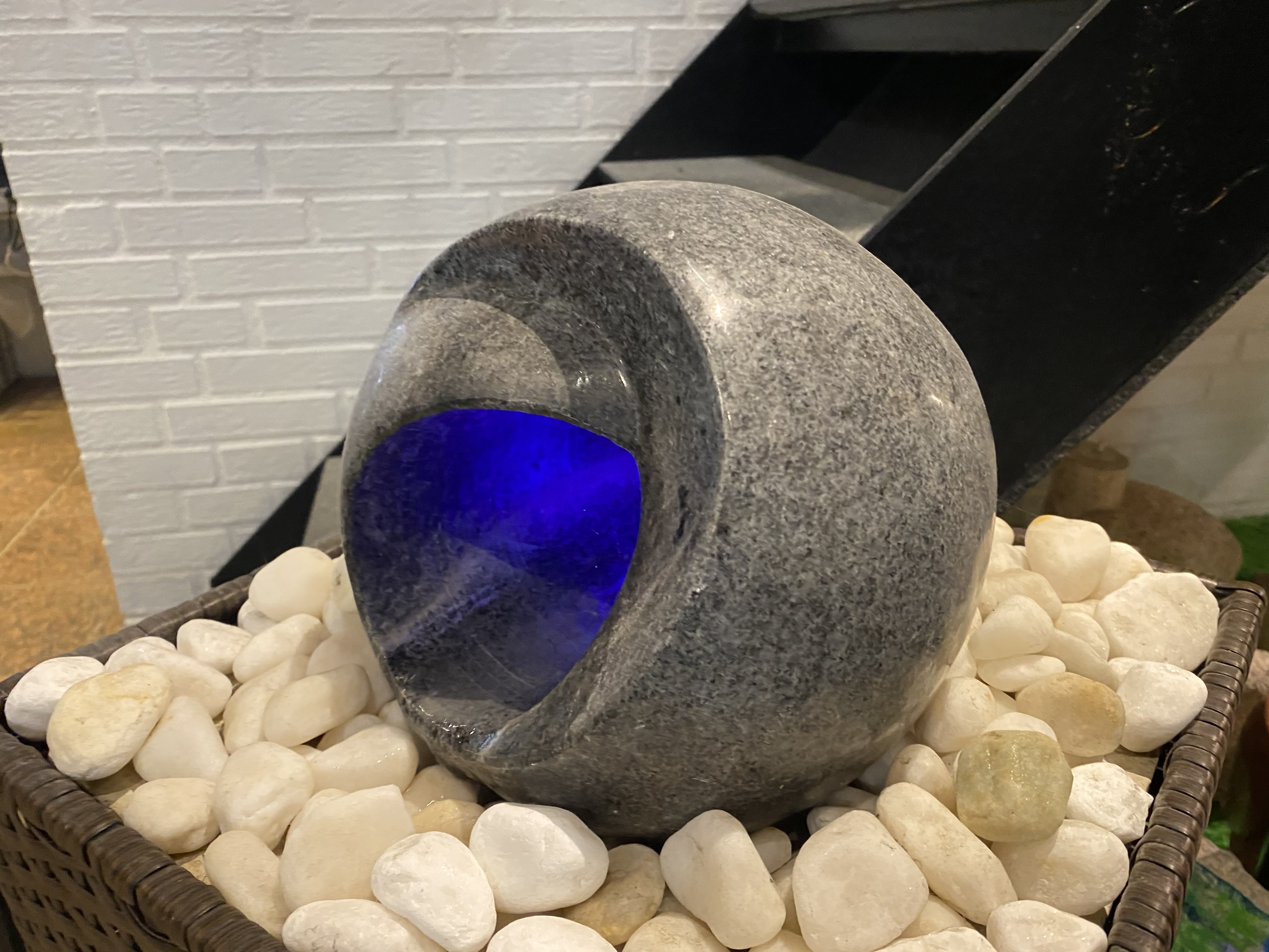 - Den leveres i gråsort poleret granit med kastanjefarvet rattan cover og blåt LED lys