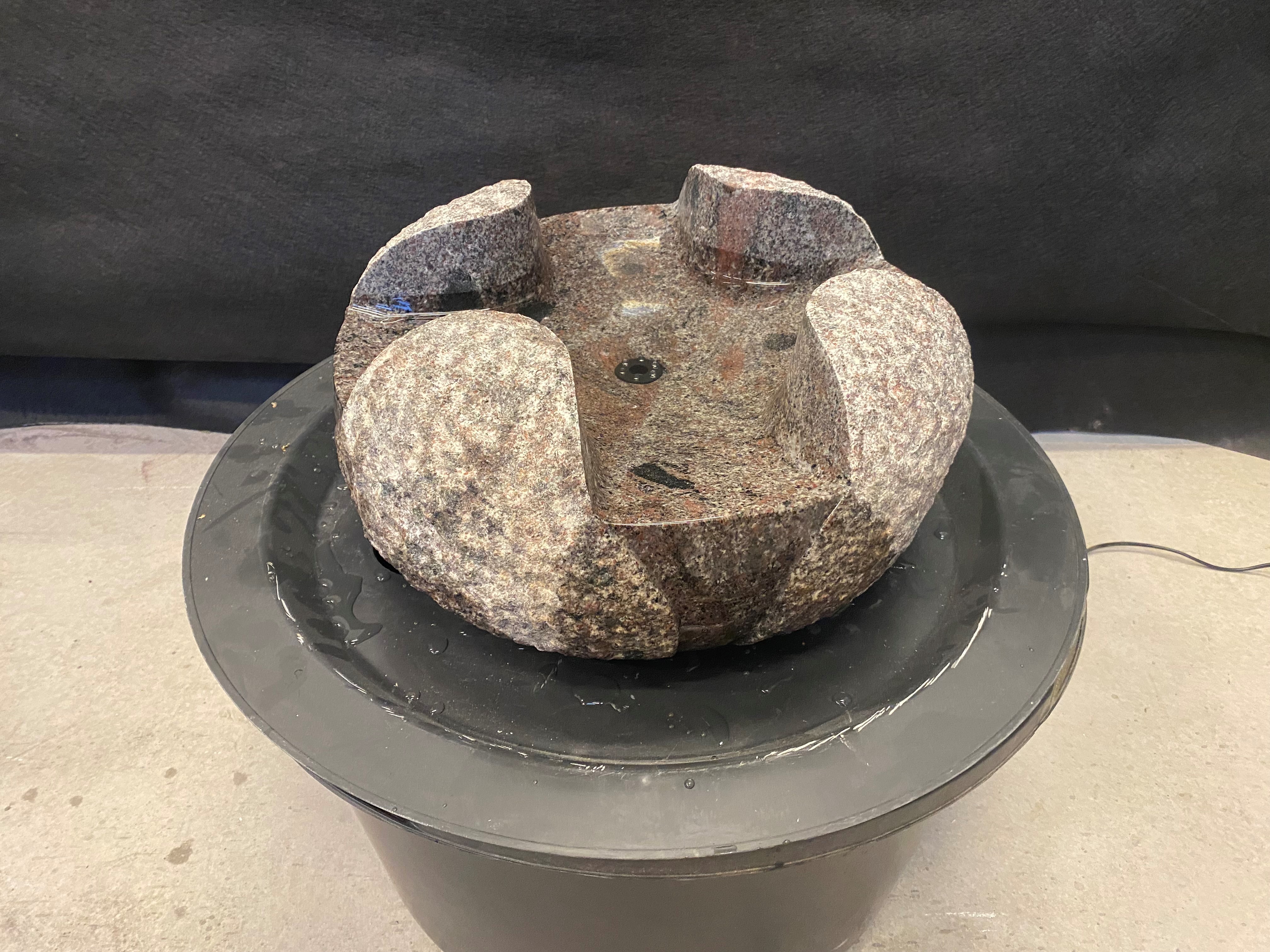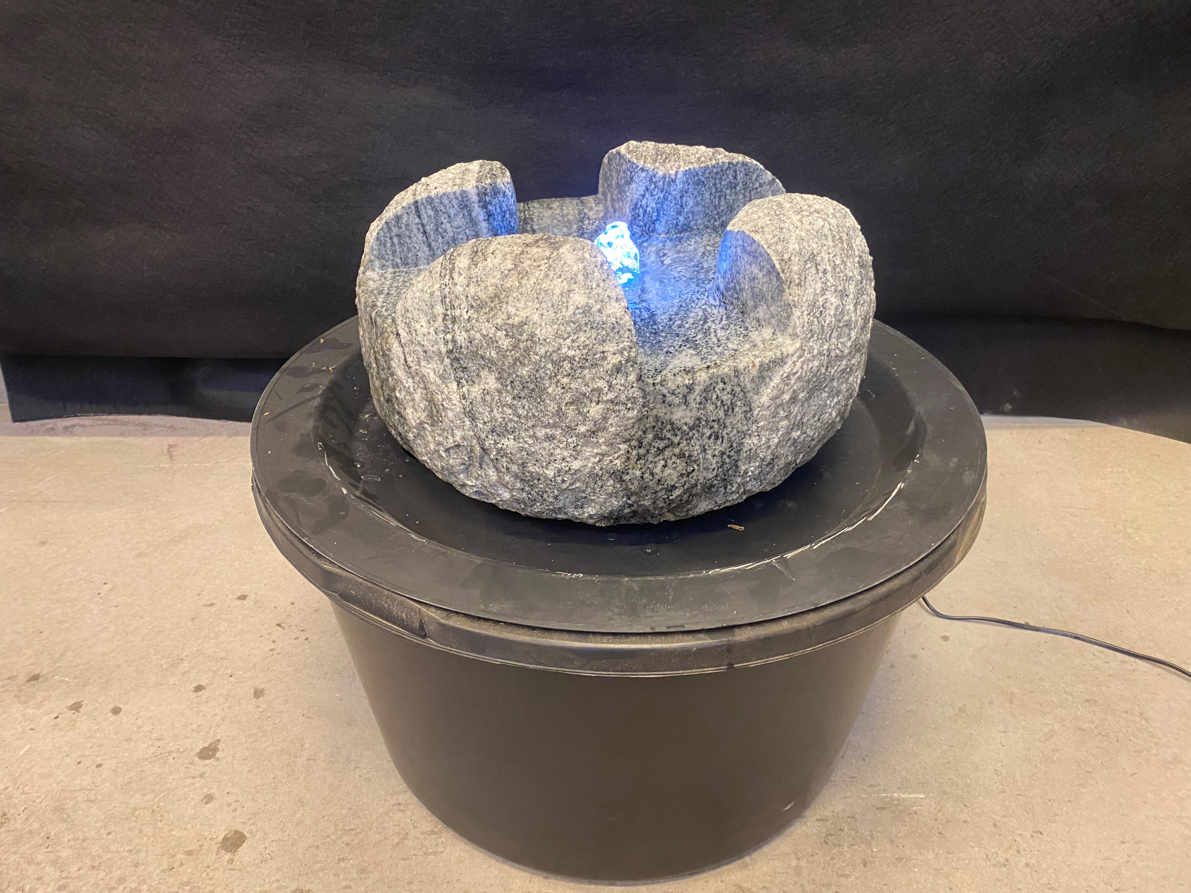 Vandsten Udhulet kugle i indisk granit. Fås både i Paradiso Lilla og Kuppam gråblå. Indersiden af vandstenen er poleret mens de høje yderkanter står rå.