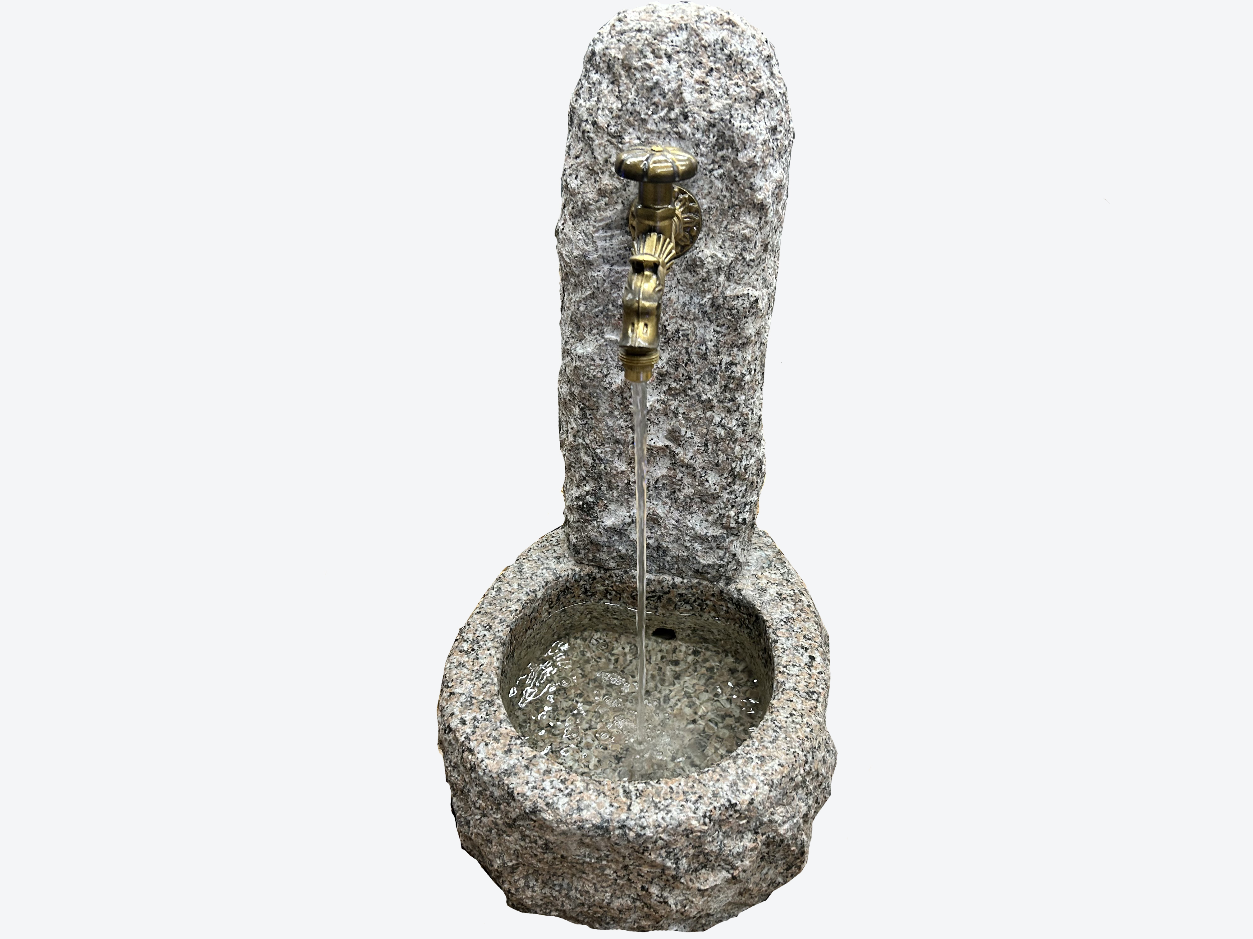 Komplet vandsten med vandhane. Slut pumpen til og se vandet løbe ud af vandhanen ned i karet. Vandstenen er komplet med pumpe og slange, og kræver derfor hverken balje eller bassin for at fungere, da vandet cirkulerer i eget system. Selve stenen er produceret i rosa granit.