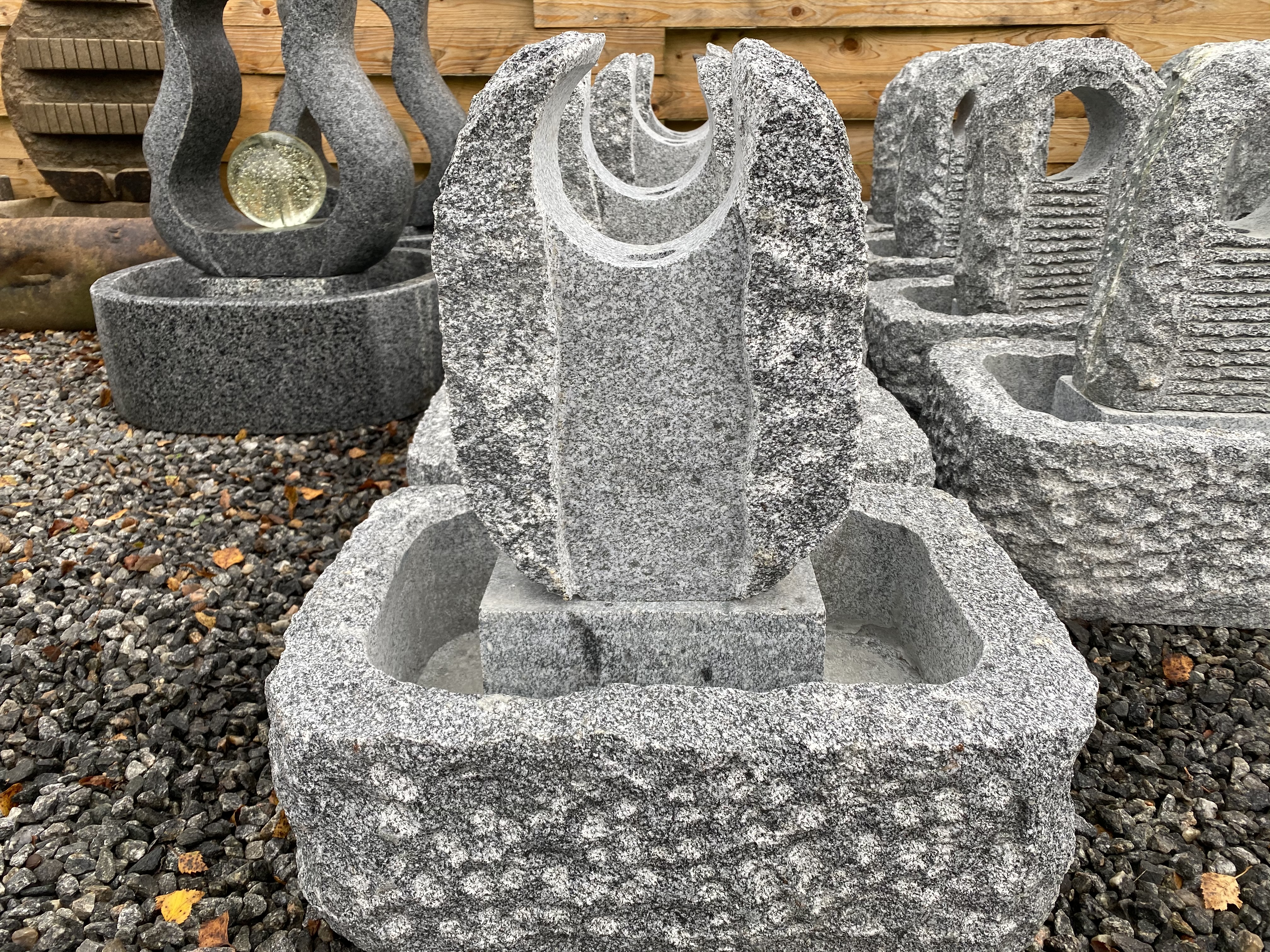 Her ser du et komplet vandmiljø i gråsort granit med rustik råkløvet overflade.