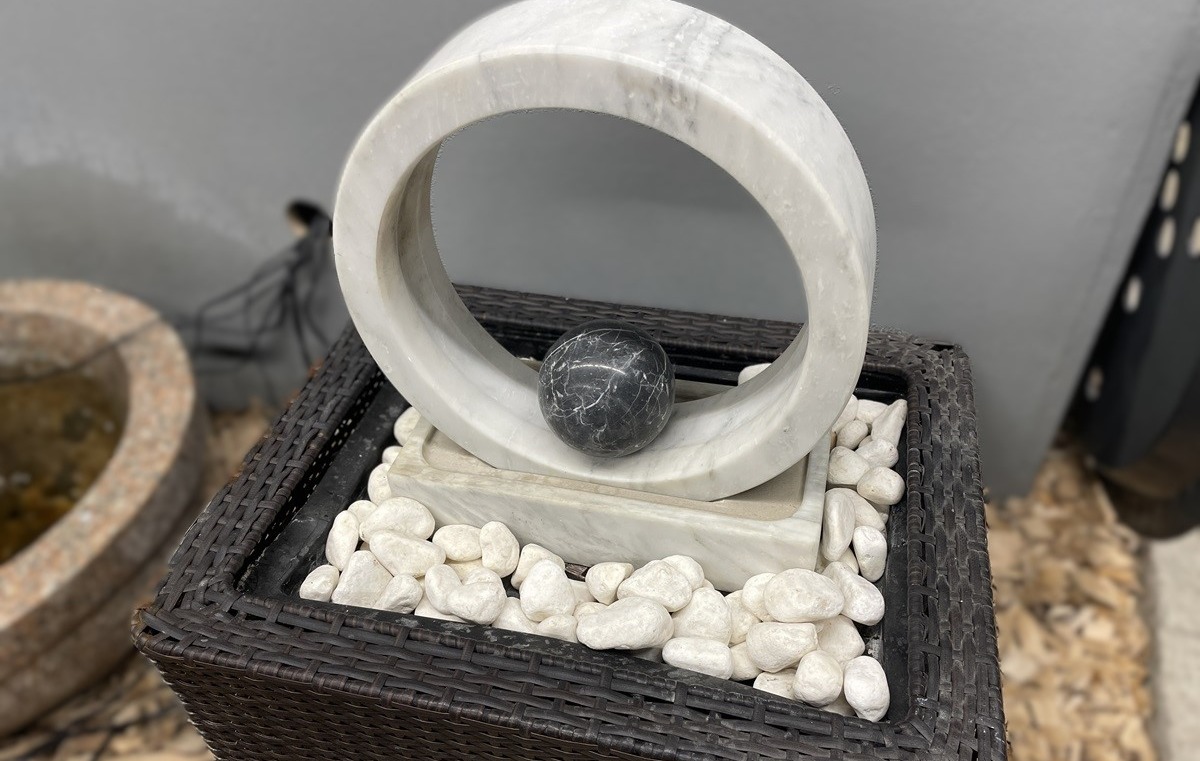 Vandreservoir med rattan-cover og ring af marmor med roterende kugle.