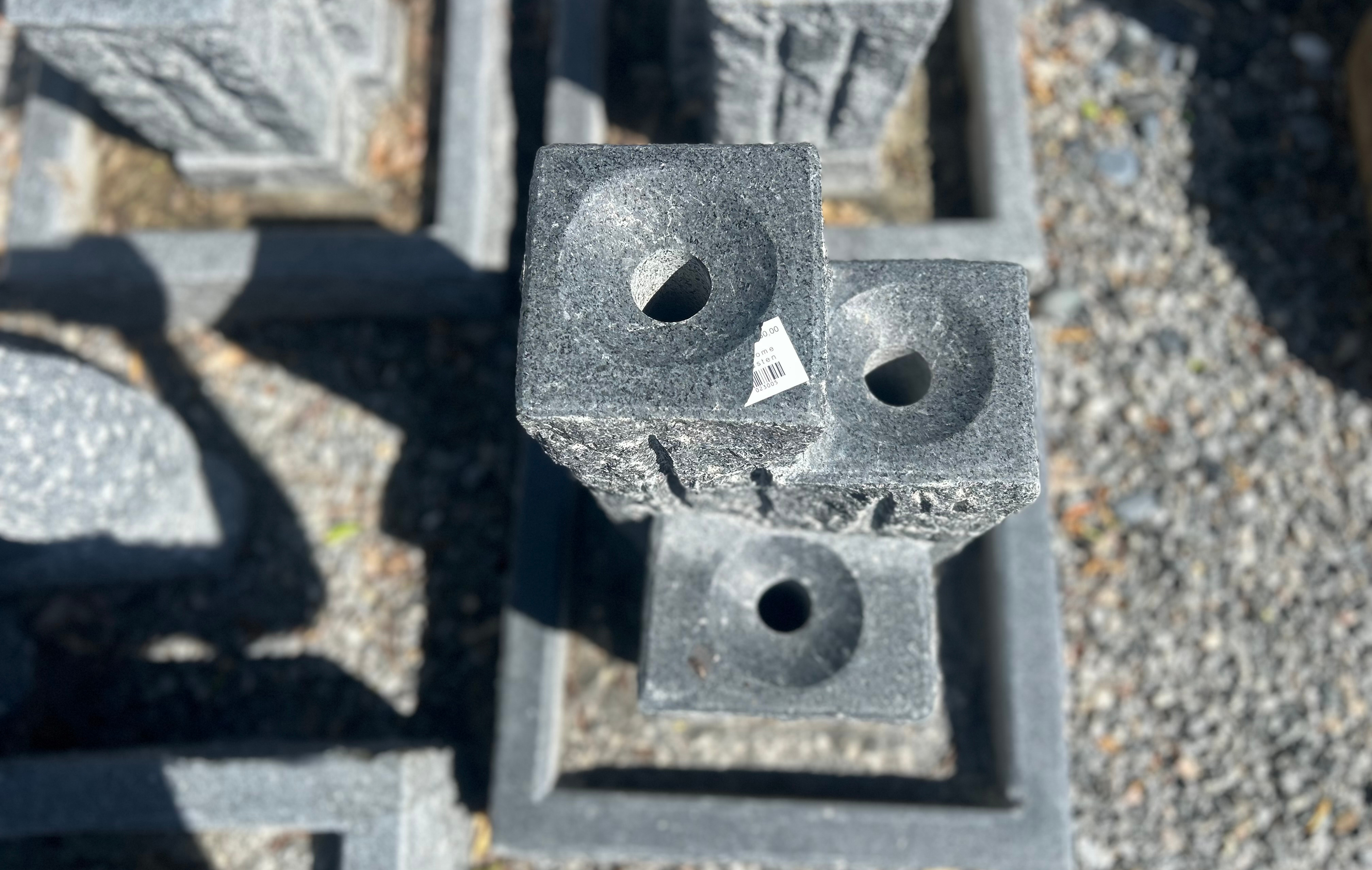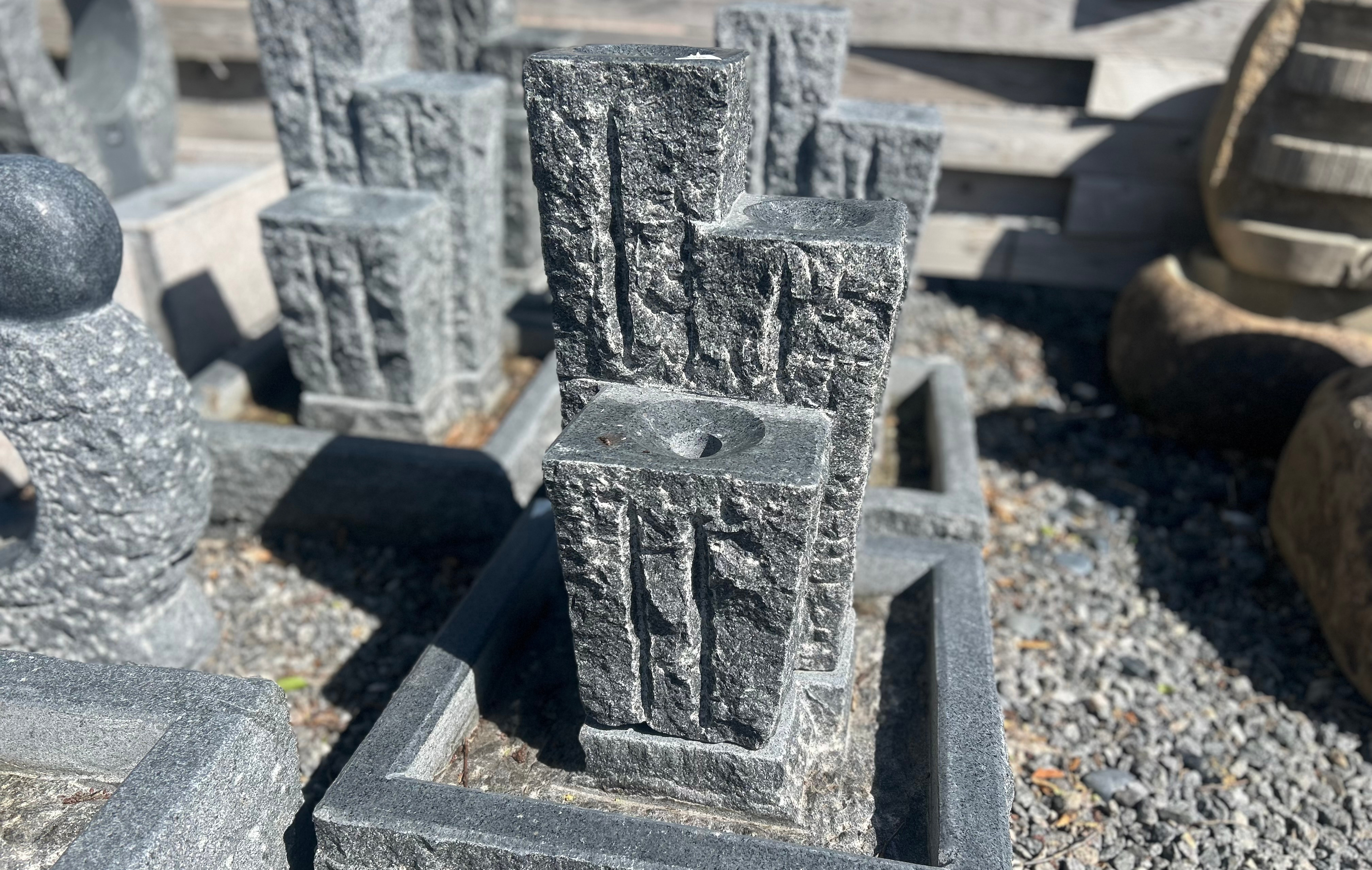 Vandsten Treesome i gråsort granit. Vandstenen har 3 polerede toppe mens resten står rustikt, så vandet kan risle ned over de kløvede flader. Reservoiret er to-delt, hvilket vil sige at sten står løst ovenpå karet, så man nemt kan komme ned til pumpen.