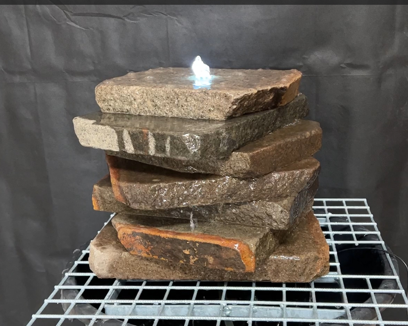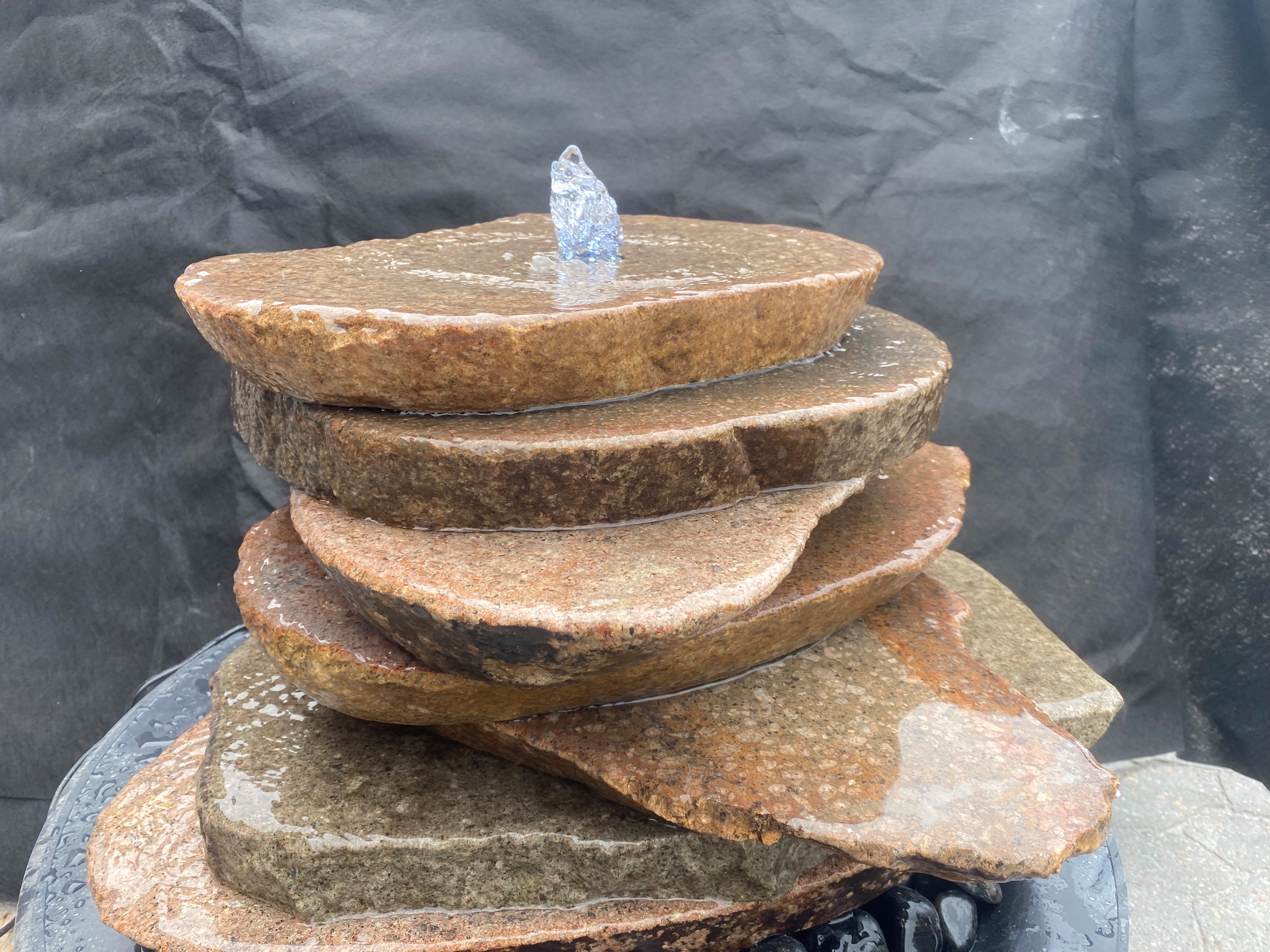 Vandstenstårn af markstensskiver. Der er lavet gennemgående hul til slange og ledning så der kan sidde LED lys i toppen.