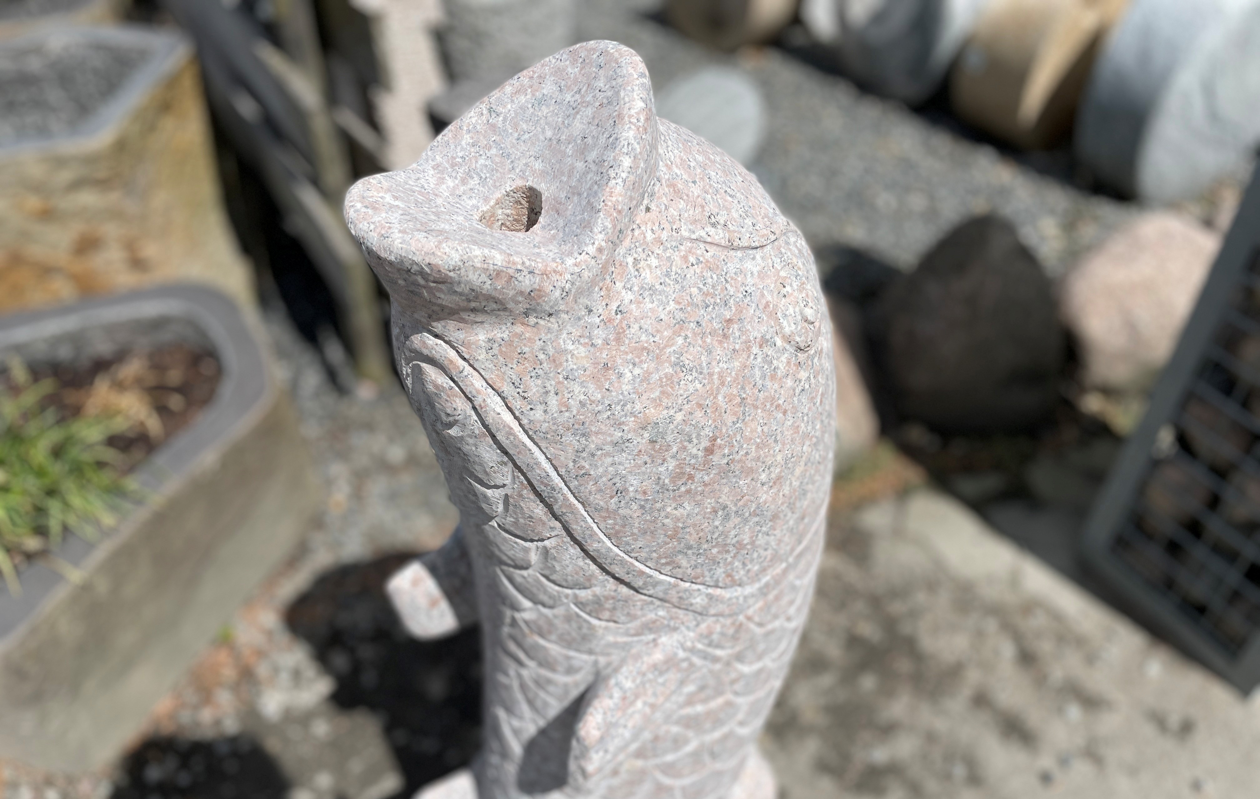 Vandstenen har polerede overflader, som frembringer granittens flotte farvespil, og detaljer der giver fisken et særligt udtryk. Den vil være et unikt dekorationselement ved hus og have.