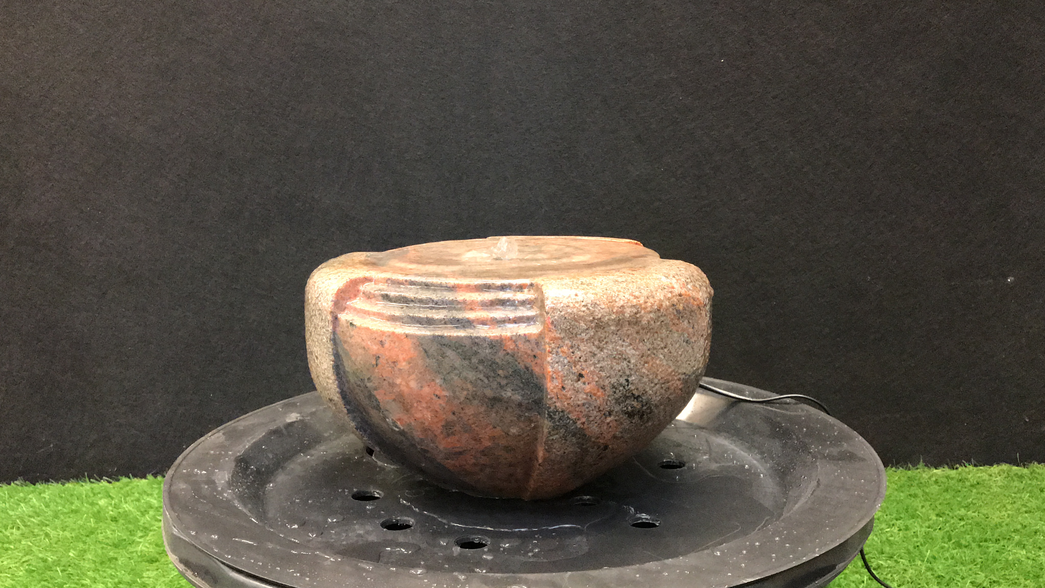 Mette vandstenen er af multifarvet indisk granit, som fremstår rød. Denne farve er især tydelig, når stenen er våd, hvor de utroligt flotte rødlige nuancer fremhæves. Vandstenen har tre små trapper, hvor vandet falder ned og giver en ekstra rislende og beroligende lyd. Udover de tre trapper, har stenen også tre rene sider, der fremstår mere ru. Her løber vandet stille nedad alt efter hvor højt man sætter niveauet på sin pumpe. Vandstenen står dog uden lys, da der kun er mulighed for at få slange og pakning ned i hullet i stenen.