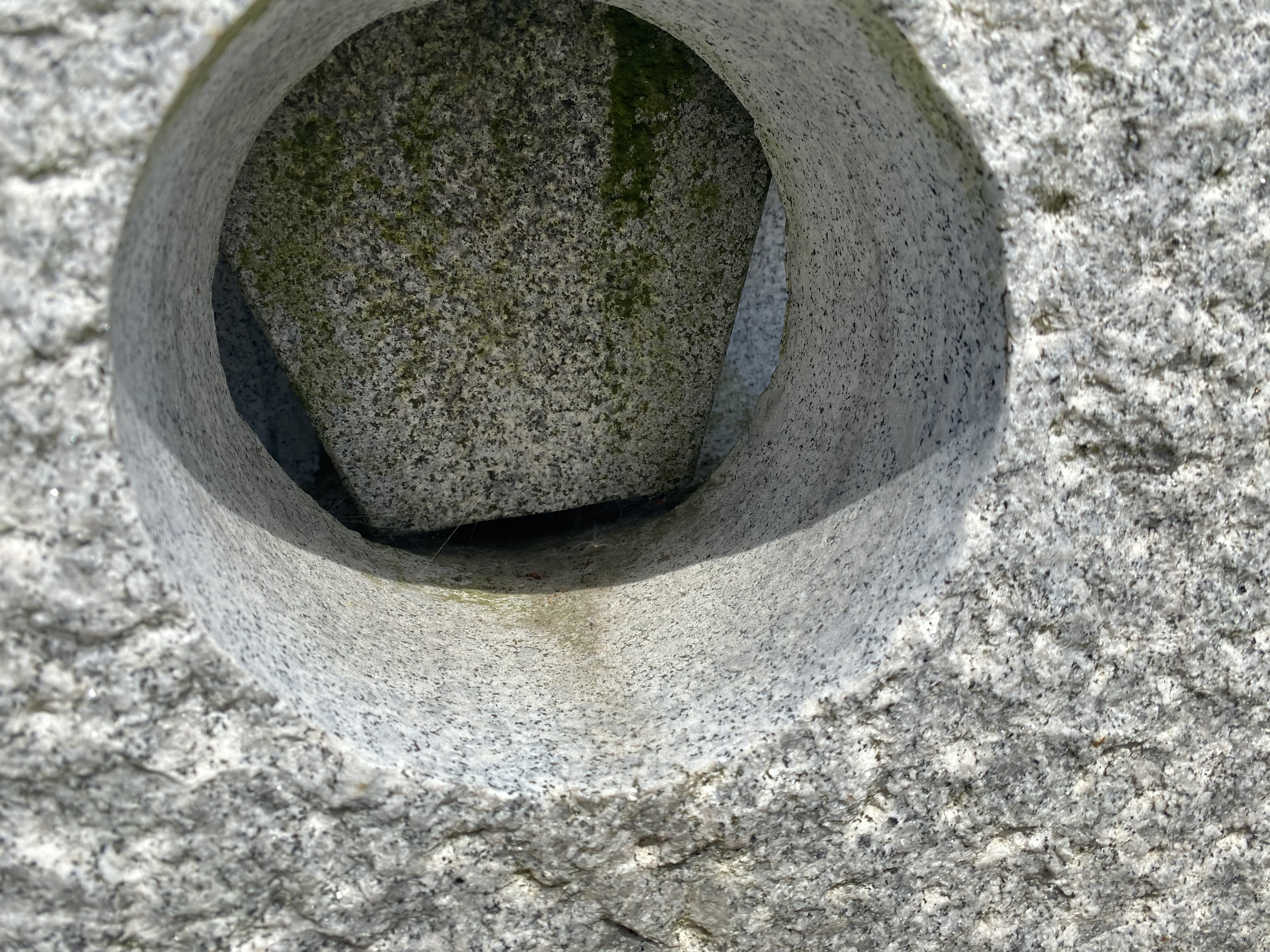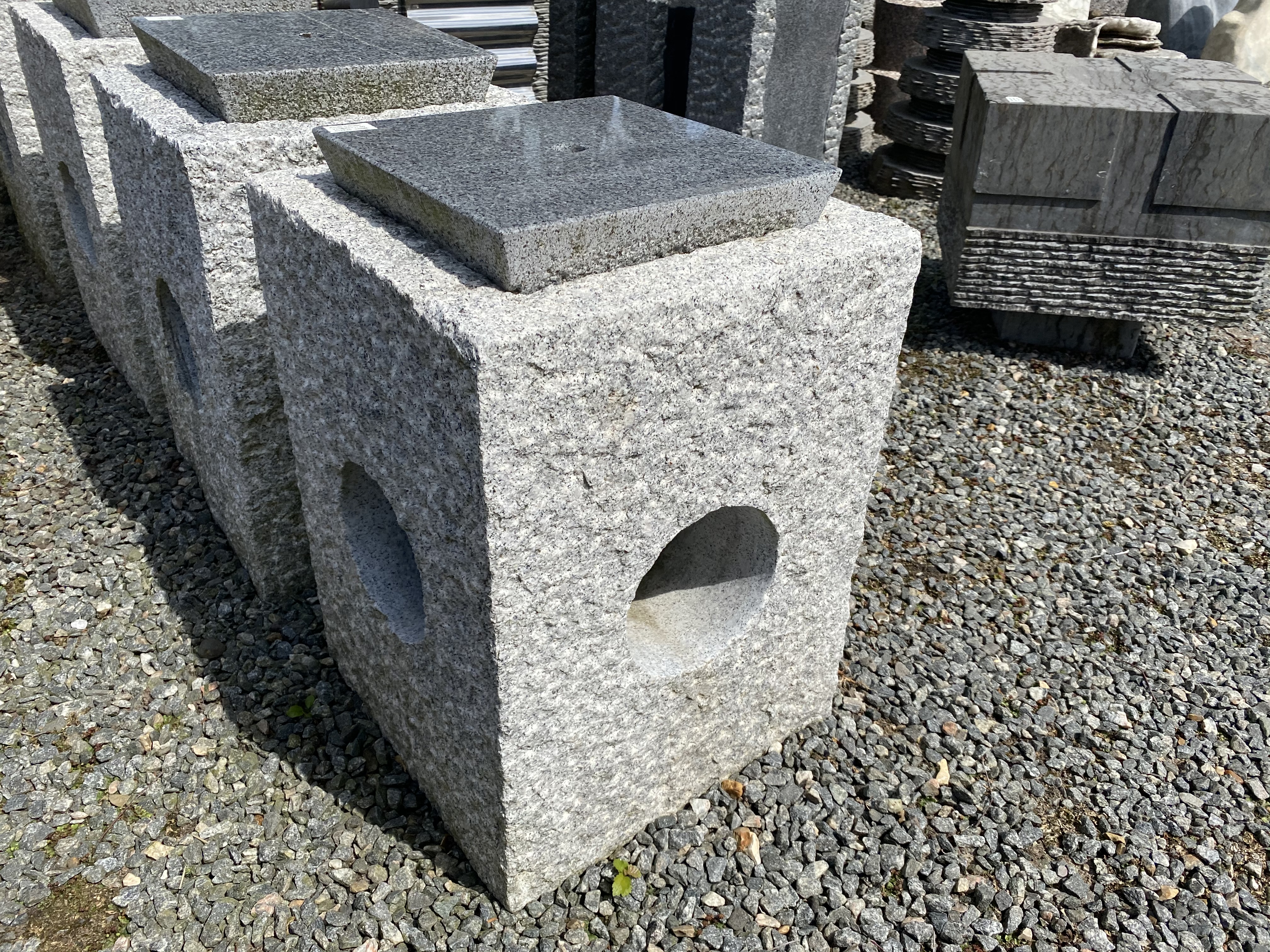 Vandsten Klods med 4 huller. Se vandet rende ned over stenen fra toppen af den polerede del, her tilsluttes vand og eventuelt lys. Vandet vil rende ned gennem hullet og komme ud gennem de 4 huller samt nedover stenen for den fulde rislende effekt.