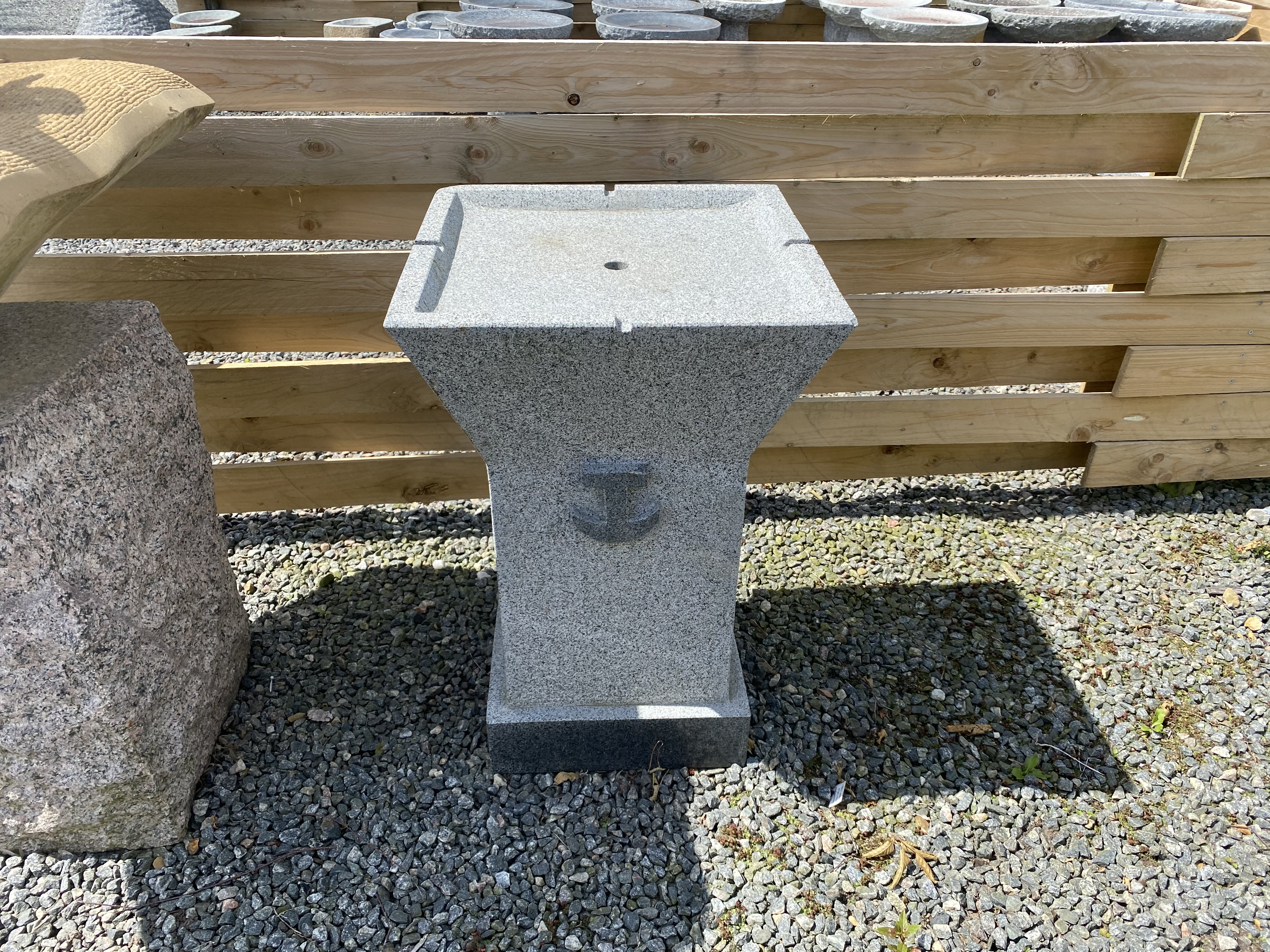 Vandsten med ankermotiv. Vandet løber over kanterne og ned af søjlen, og du kan høre vandet risle. Vandstenen har anker foran, der er poleret, og den står på en sokkel. Fontænen er perfekt, hvis man ønsker at hjælpe havens fugle til en tår vand, da de kan sidde på kanten og drikke af skålen.