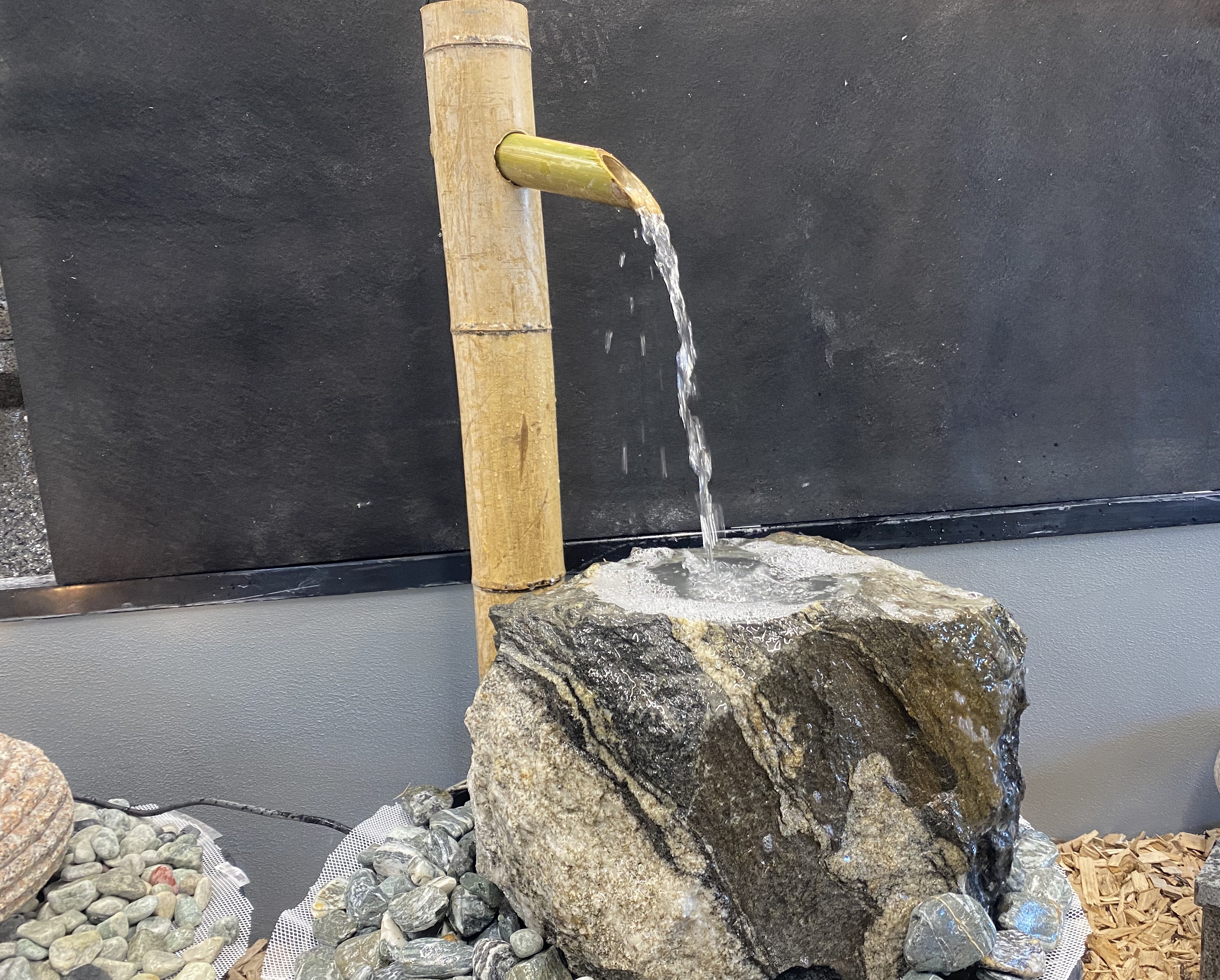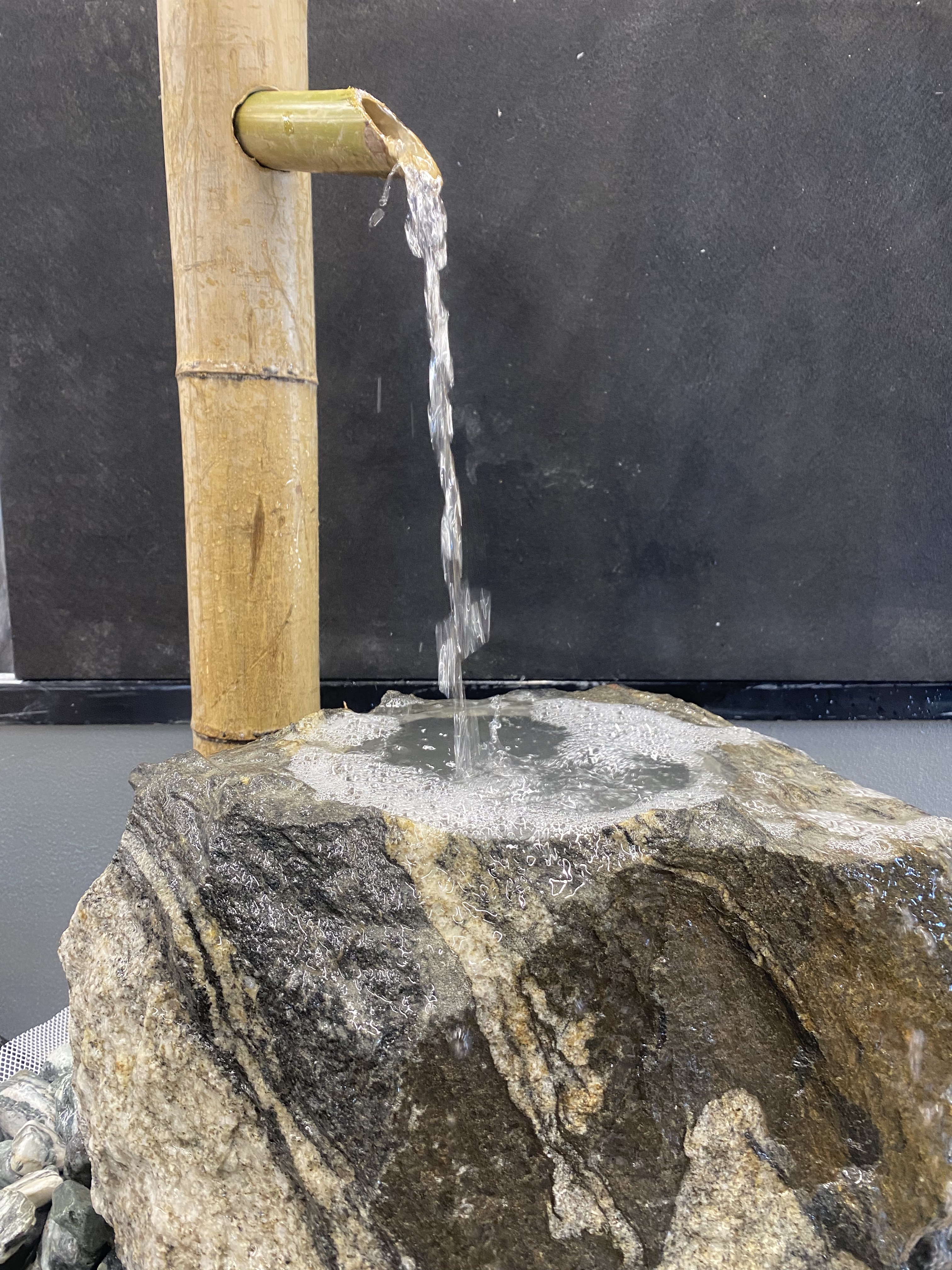 Vandstenen består af en granitsten med udhugget skål til opsamling af vandet fra et bambusrør. Når vandet løber fra bambusrøret skal det ramme stenen og løbe udover siderne på den udhuggede skål for at skabe en rislende effekt. Stenen står ovenpå en balje eller kar, så det kører konstant som et japanske ritual.