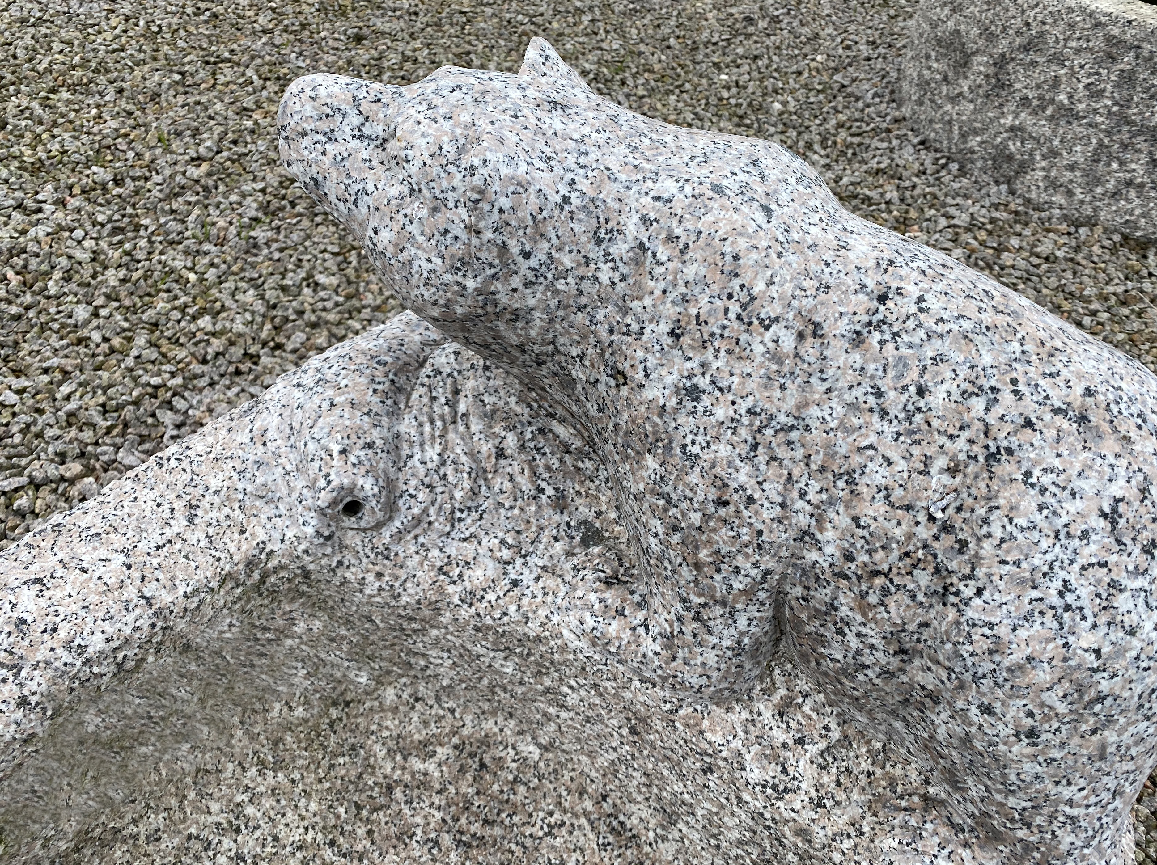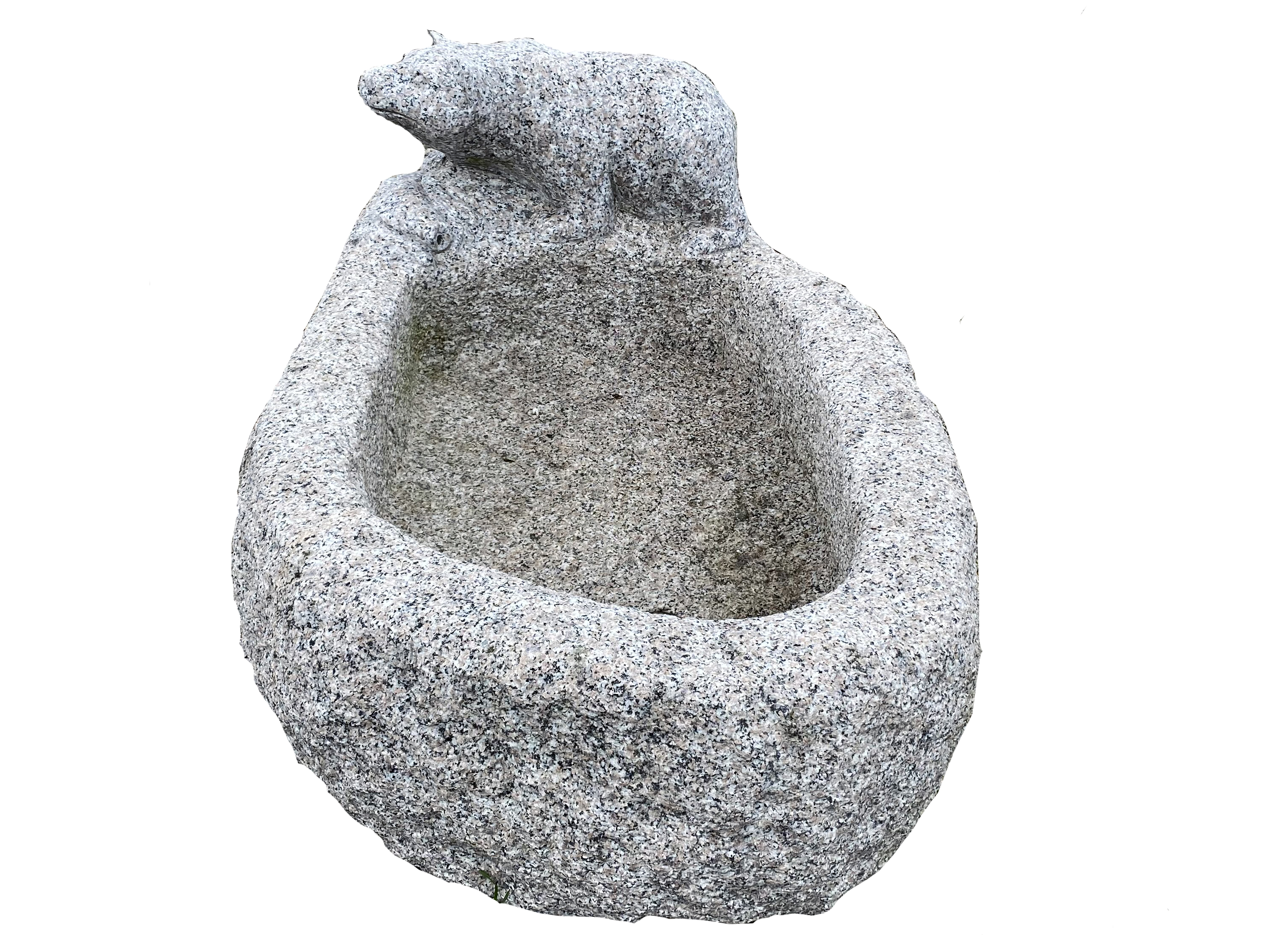Vandsten/vandreservoir bjørn med fisk i rosa granit.