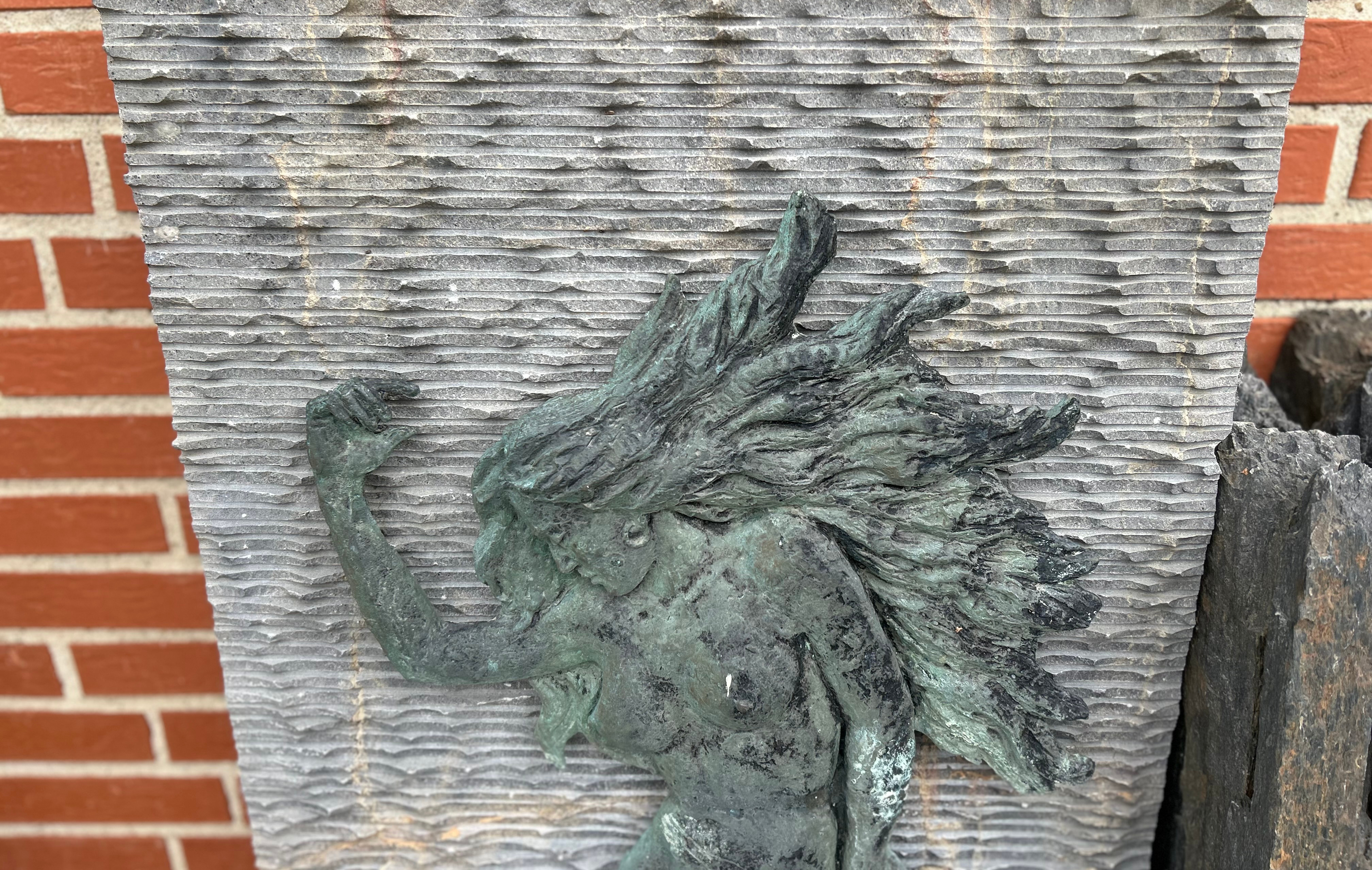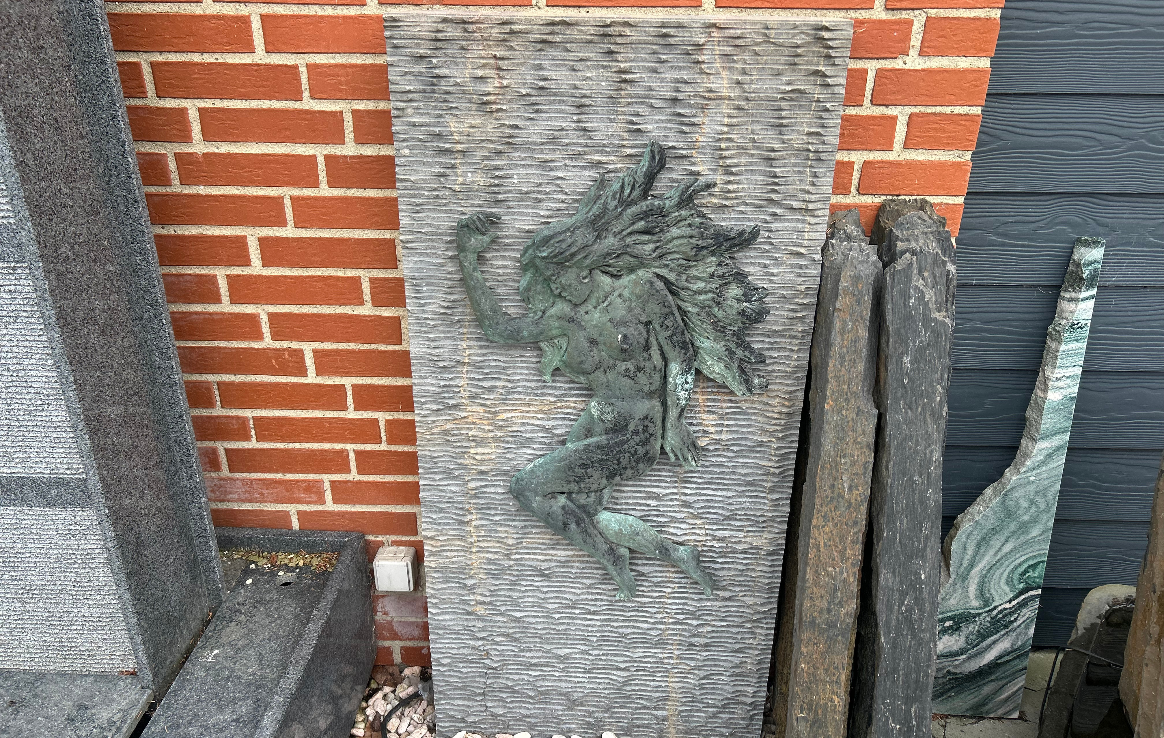 Vandsten i grålig limestone med bronze motiv af en kvinde på forsiden.