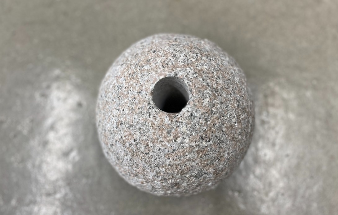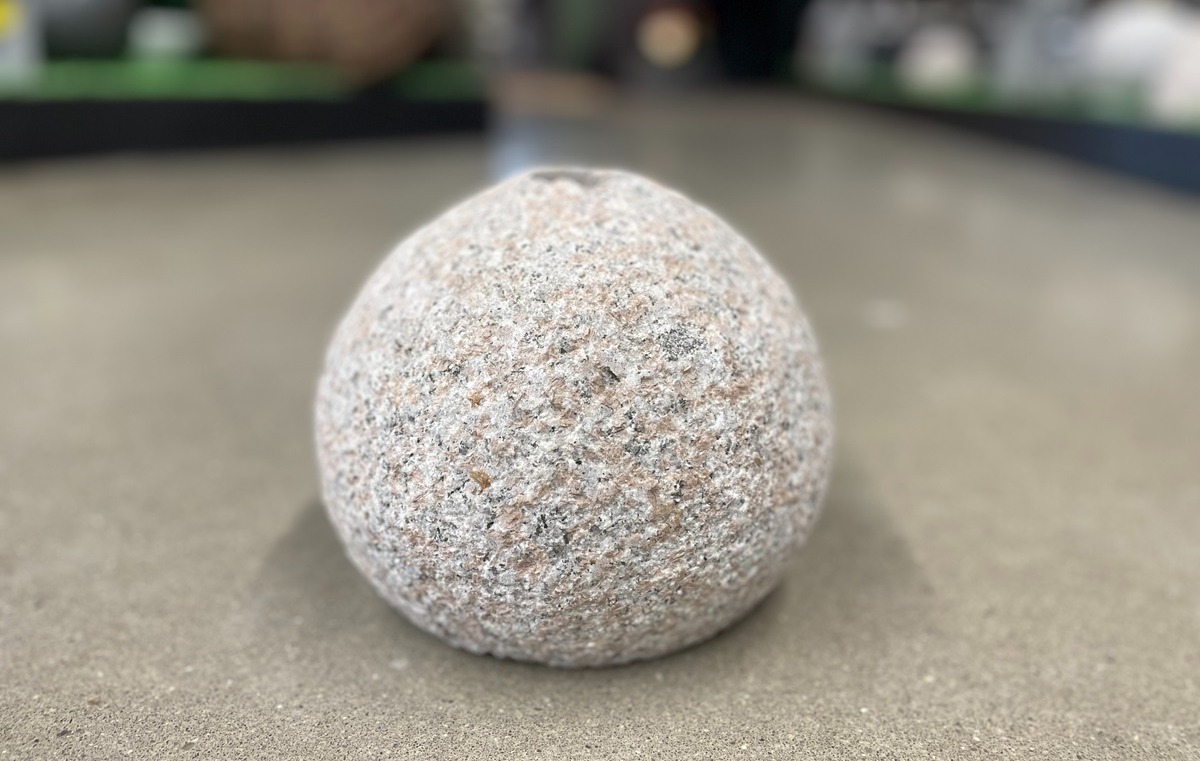 Rund vandsten lavet af rosa granit, udformet som en appelsin. Vandstenen har en plan bund og står derfor helt stabilt på en baljeløsning eller en klods.