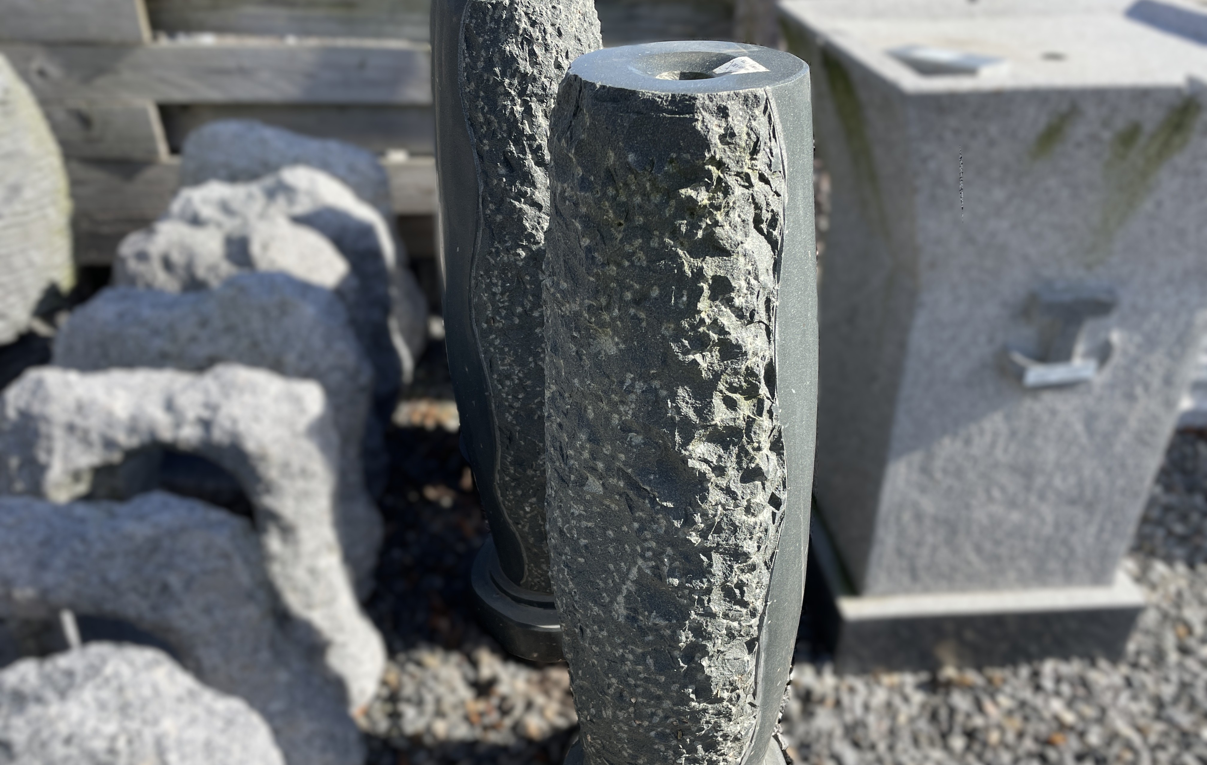 Vandsten lavet i sort granit med en rå bølge der løber ned af midten, hvor vandet vil risle stille nedad.