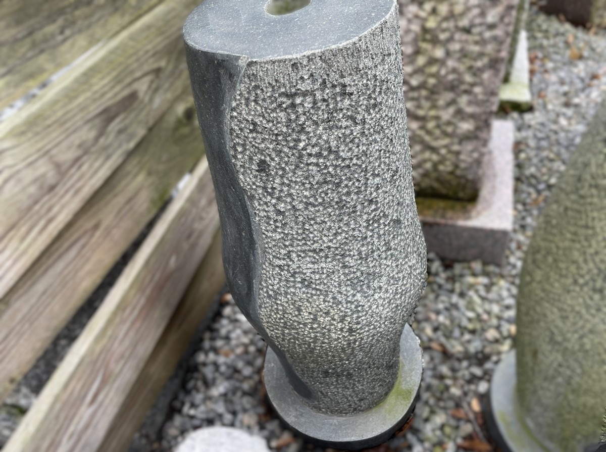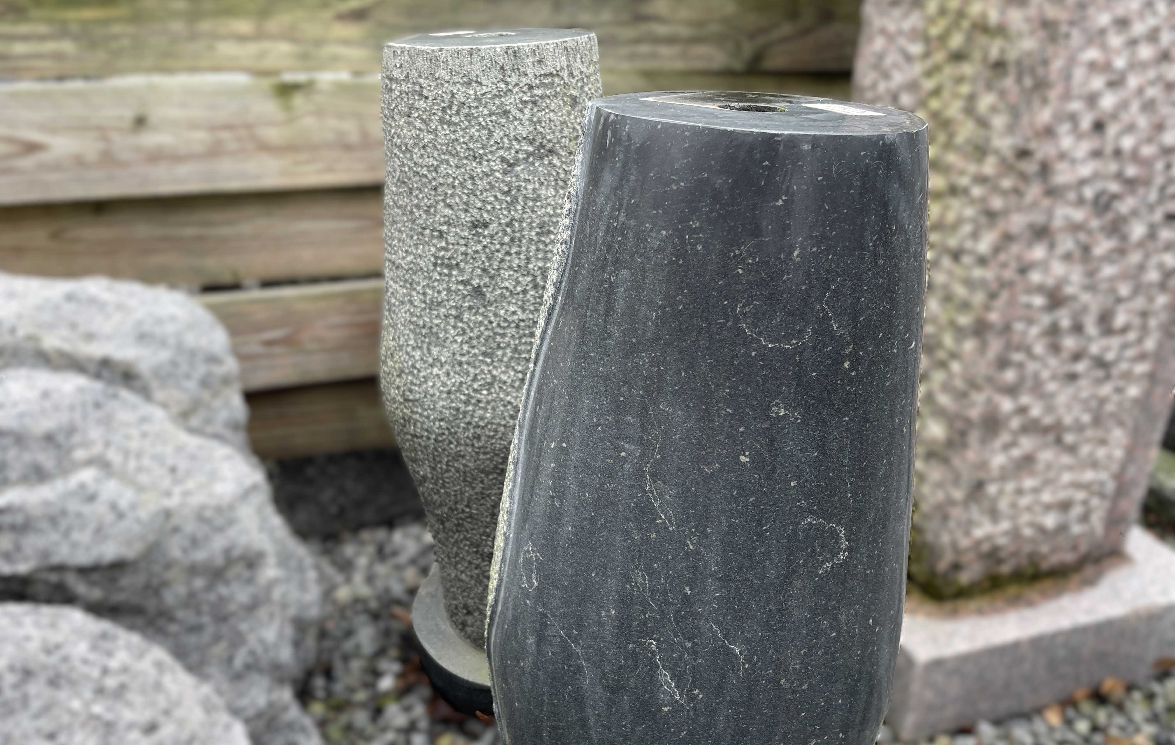 Vandsten lavet i sort granit med en poleret bølgestribe, der omkranser hele bagsiden og skaber en spændende kontrast til den anden side, der er stokhugget.