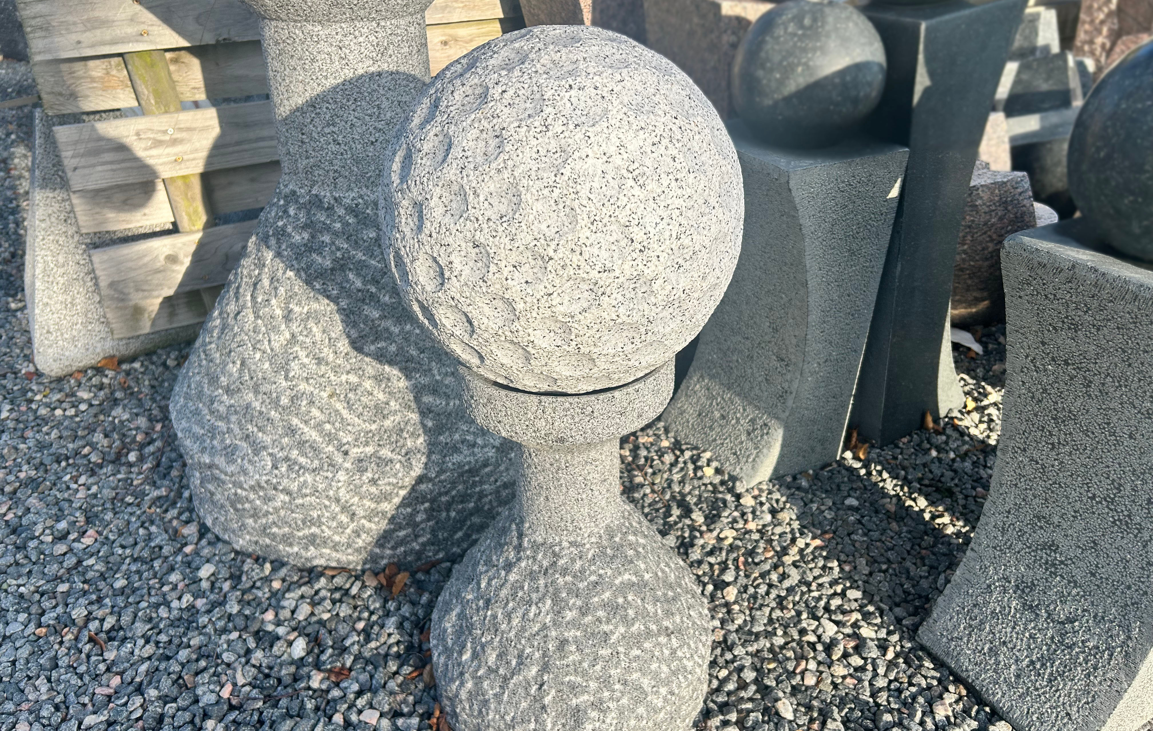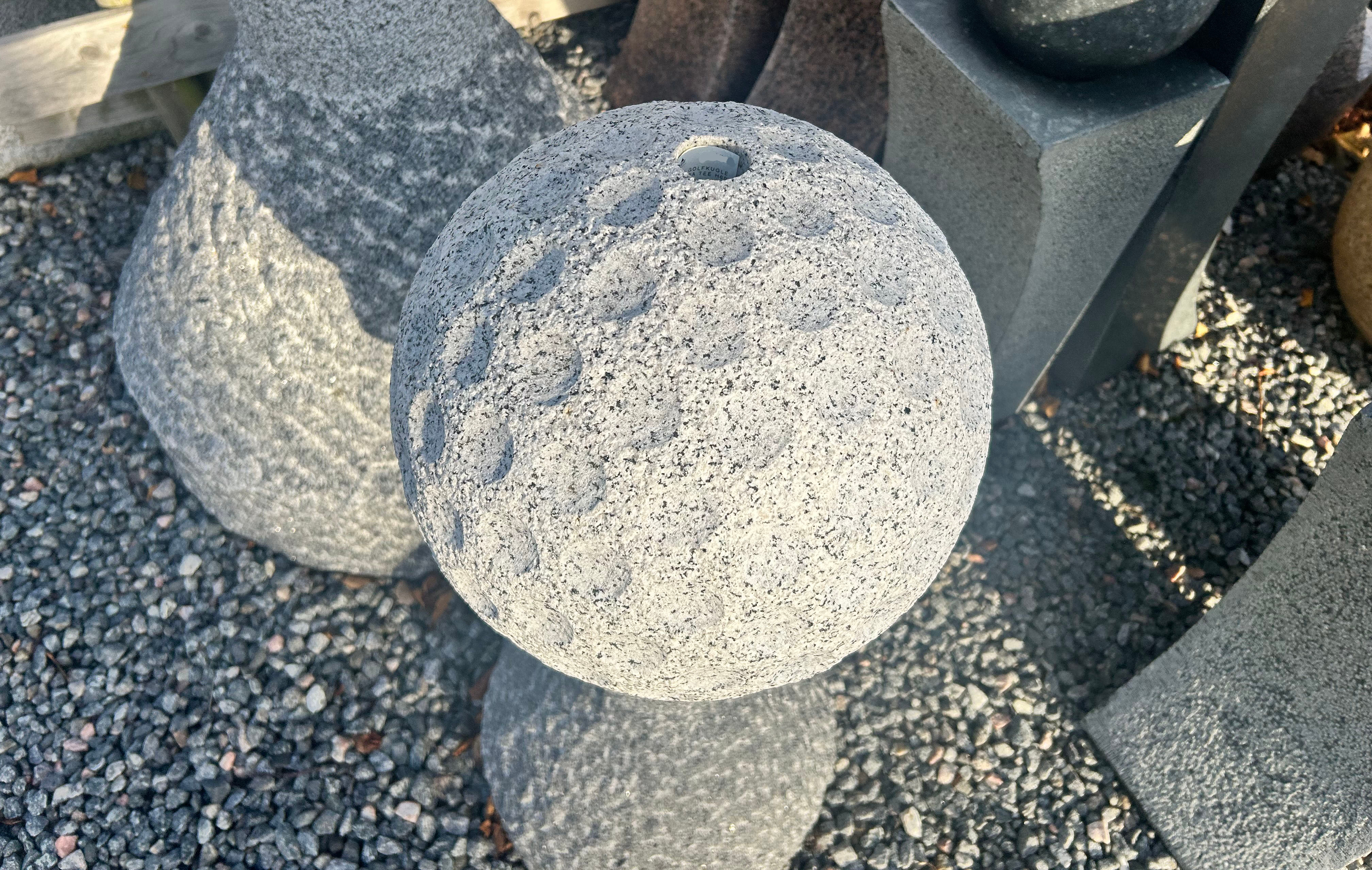 Vandsten Golfkugle i lysgrå granit på tee i gråsort granit. Kuglen ligger løst ovenpå sin tee, hvilket gør den nemmere at transportere og montere.