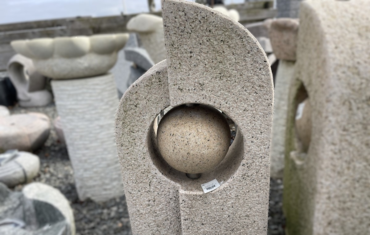 Vandstenene har en fastmonteret kugle i midten - kuglen har en poleret overflade som frembringer granittens flotte og varierende farvespil, som står i flot kontrast til vandstenens ellers rå overflade.