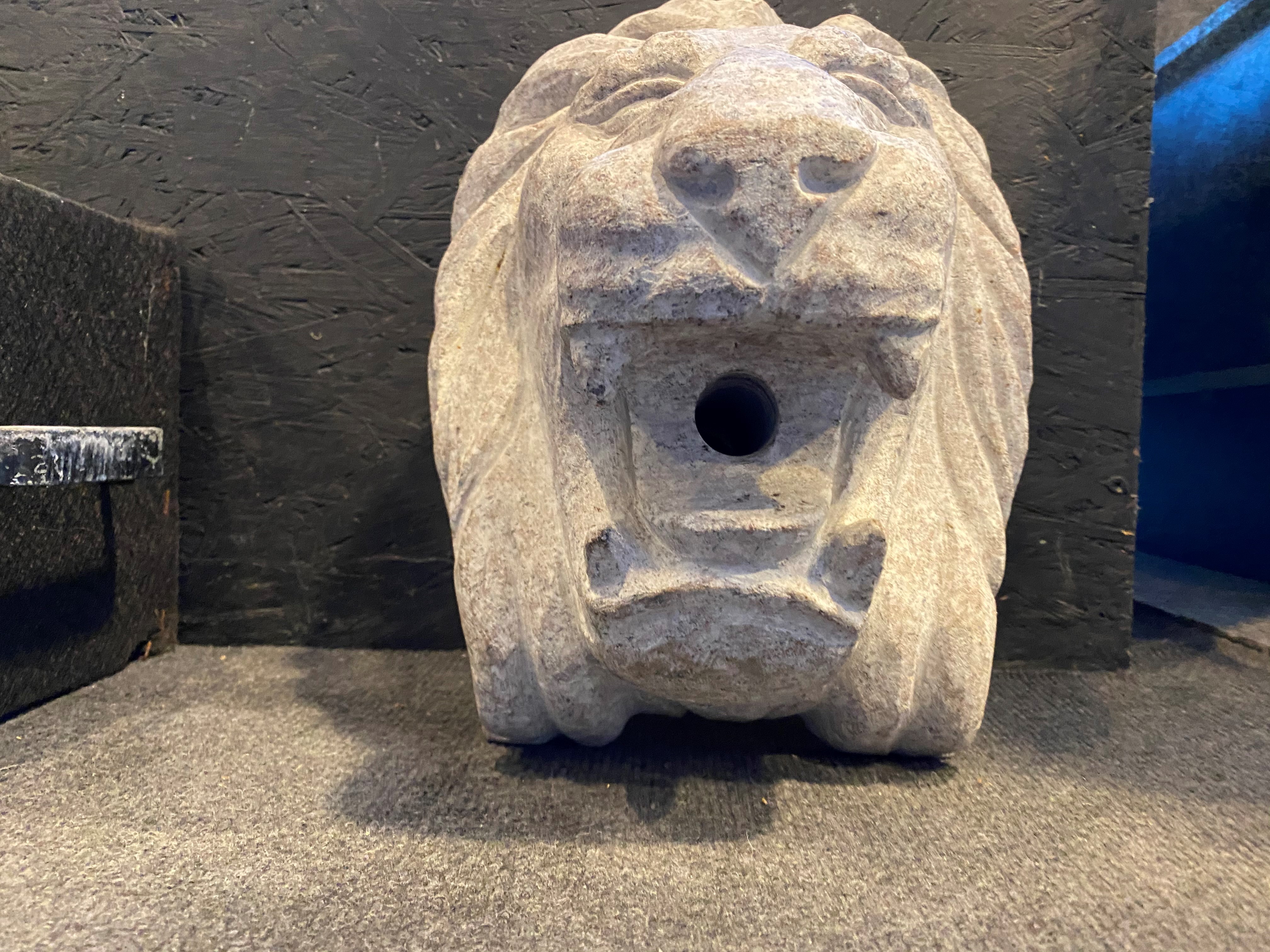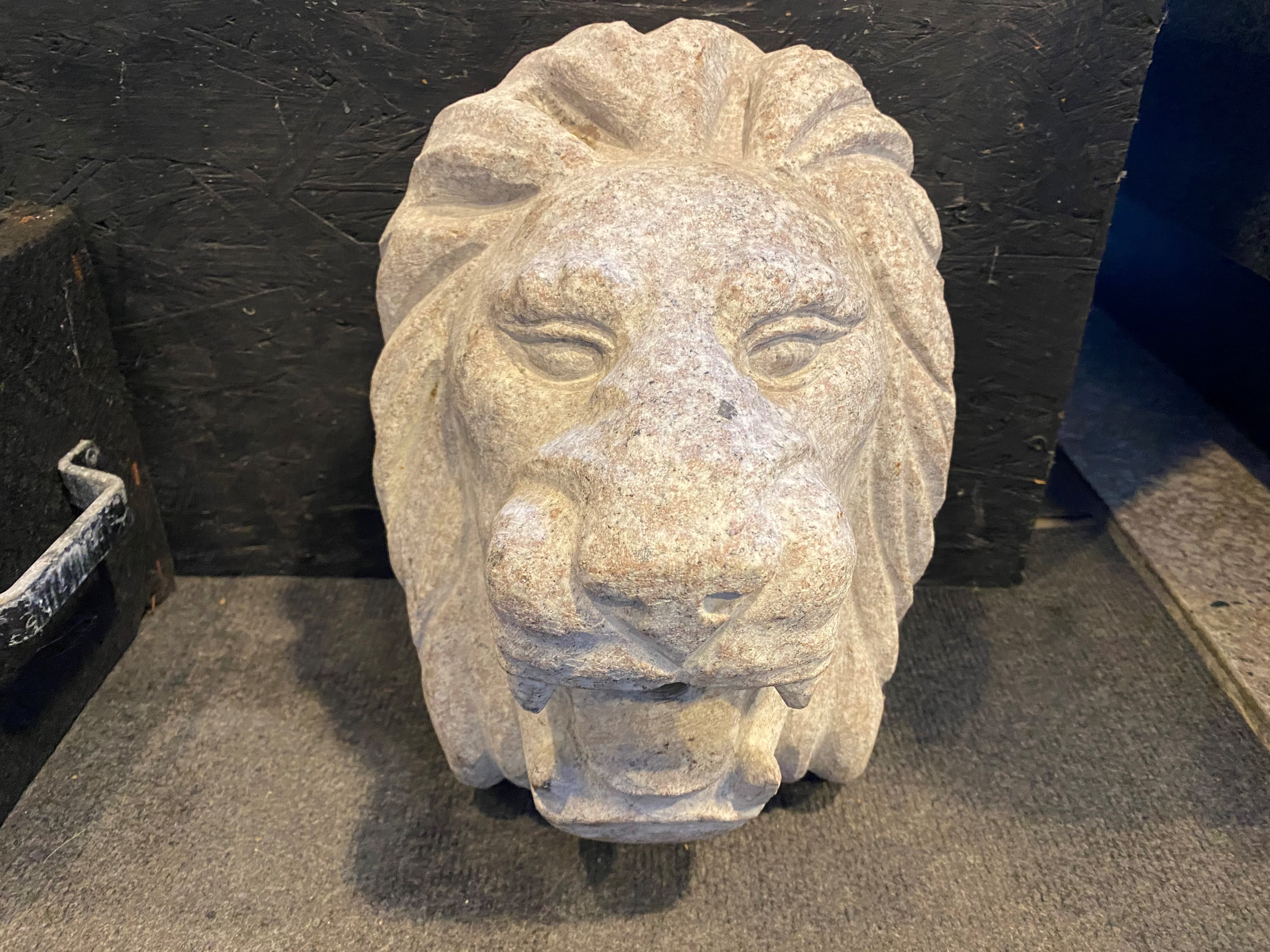 Løvehoved i lysgrå granit. Kan bruges som dekorationssten eller som vandsten, hvor vandslange sættes op i munden af løven. Alt efter trykket på pumpen kan løven sprøjte meget eller lidt vand.