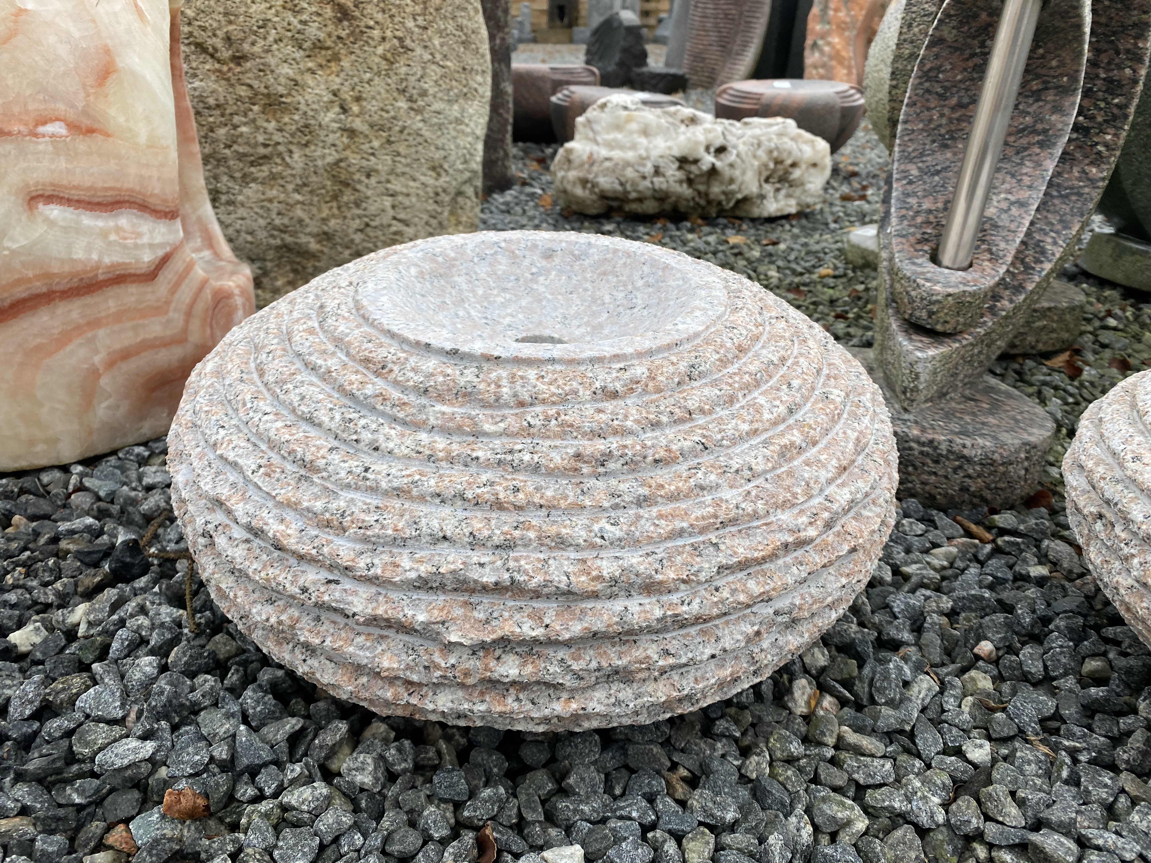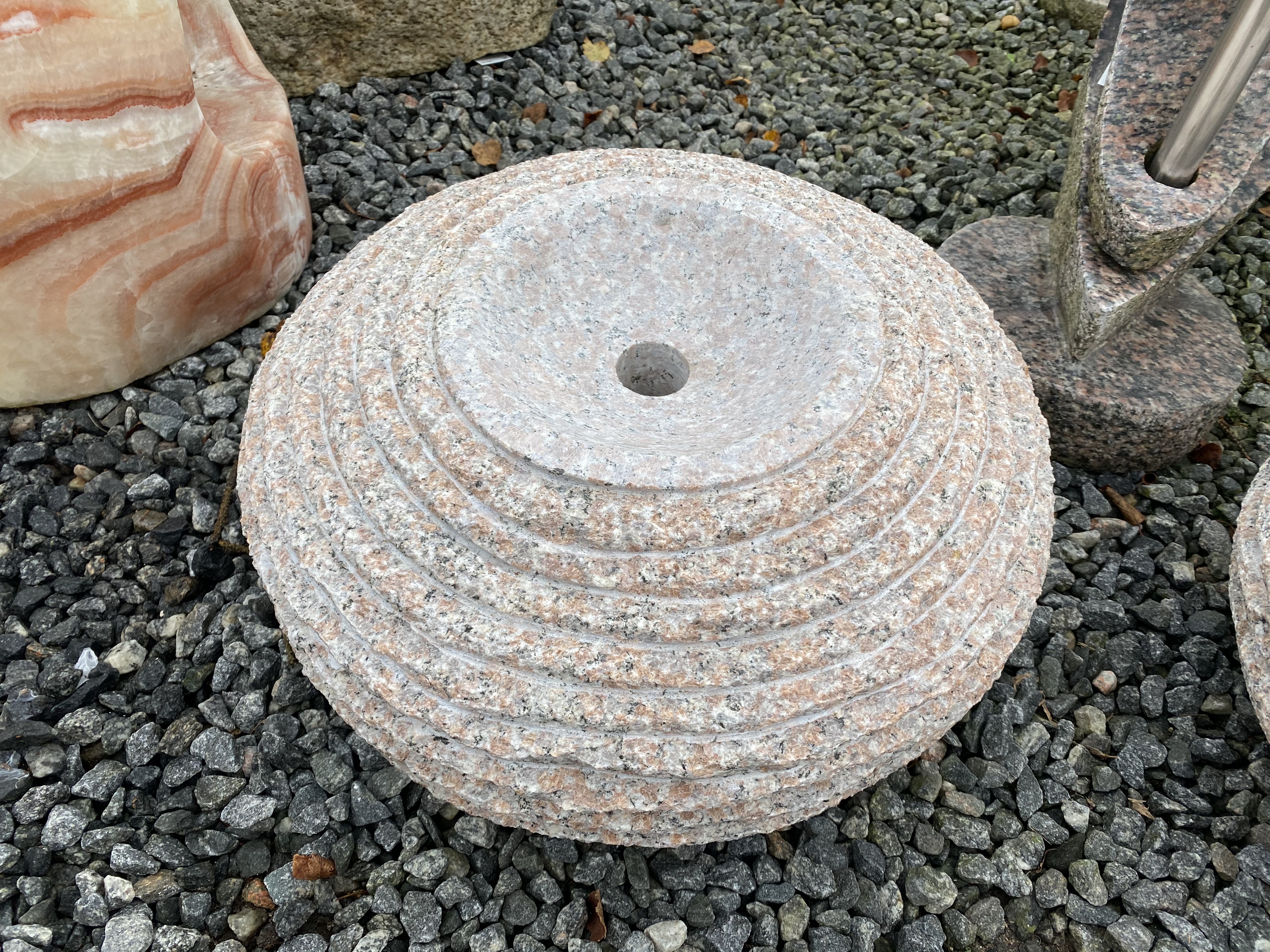 Vandsten Lone i rosa granit. Vandstenen har rillede sider som vandet kan løbe nedover. Vandstenen kræver en lille pumpe - se eventuelt vores baljeløsning lille - med pumpe, balje, låg, slange og pakning.