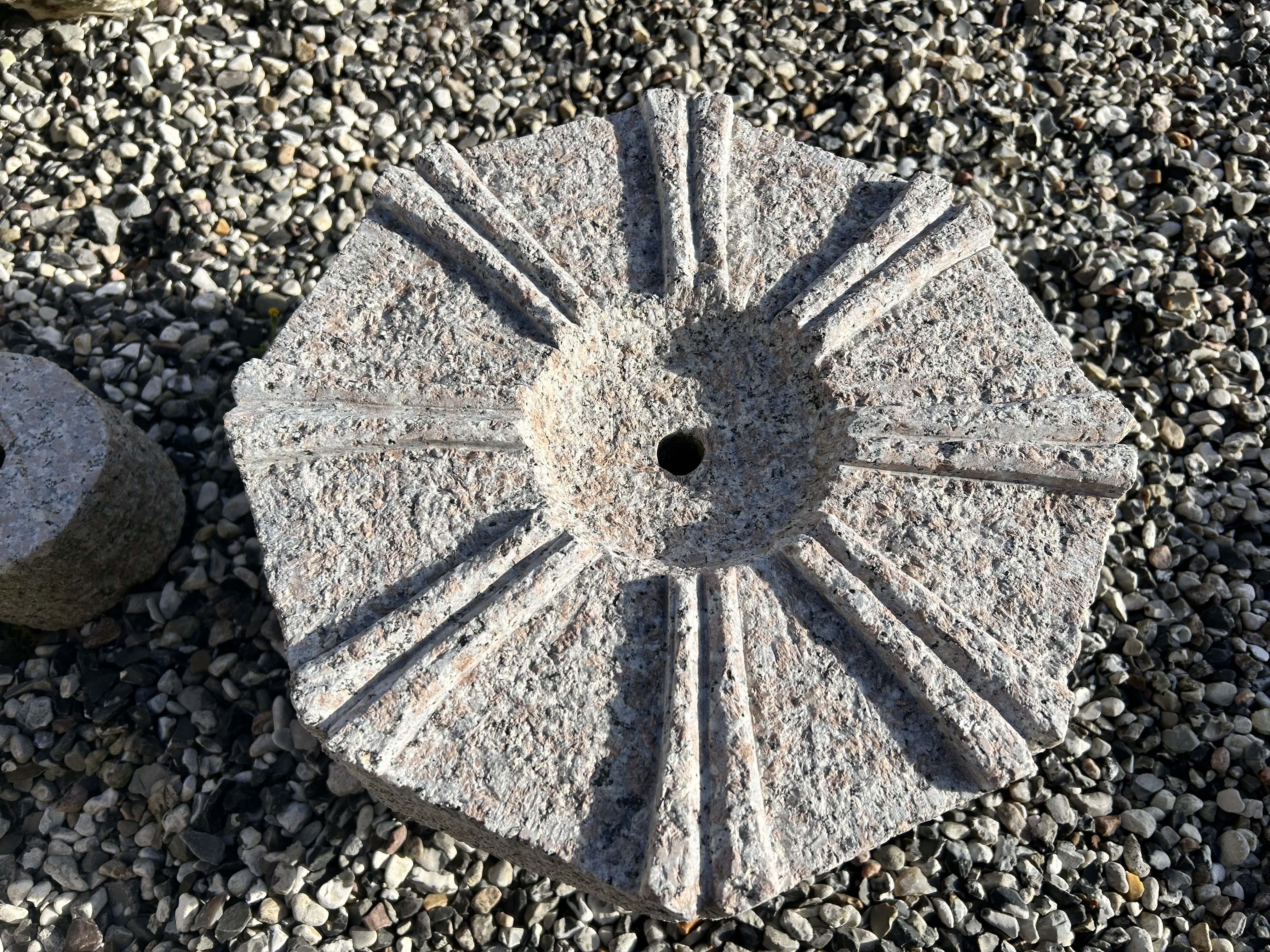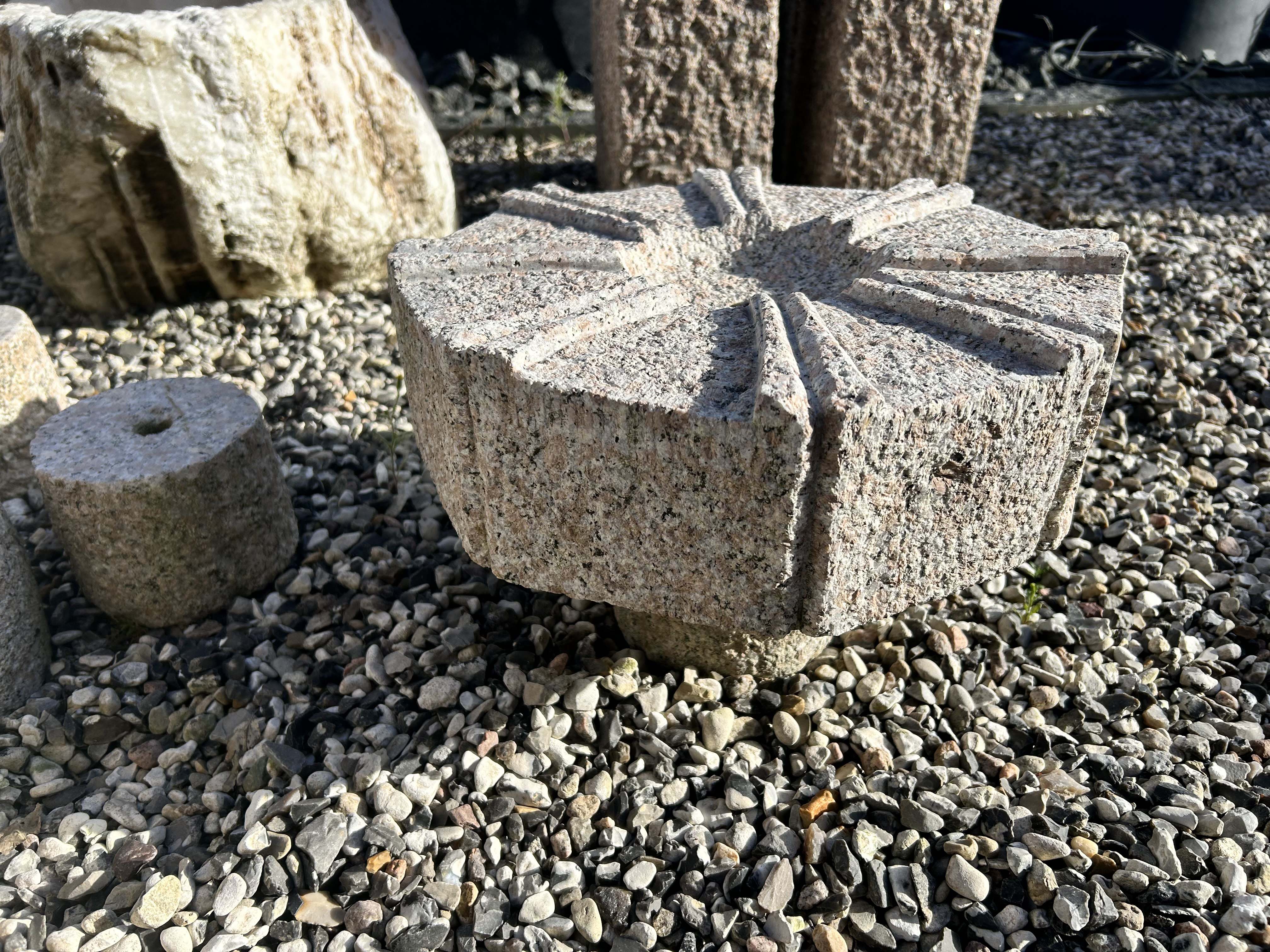 Vandsten Møllehjul i rosa granit. Vandstenen måler ca. Ø50 cm eller Ø35 cm.