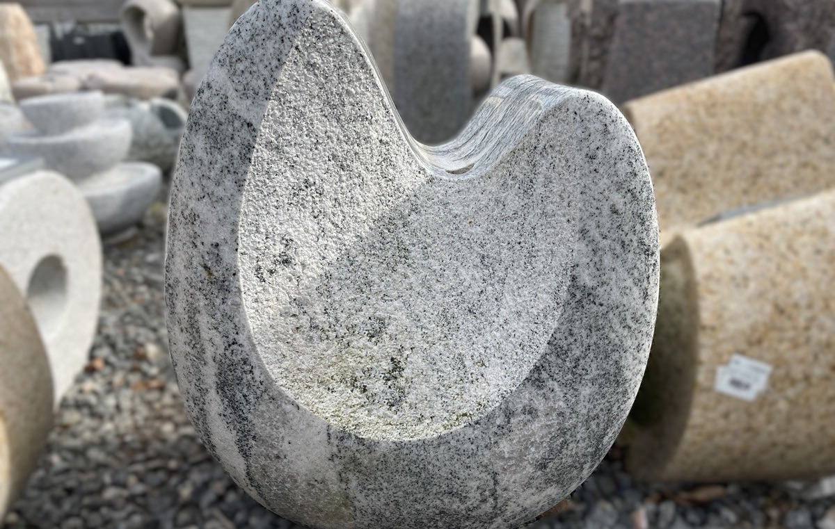 Vandstenen har store polerede overflader der frembringer den grå granits flotte farvevariationer og åretegninger. Det er et unikt dekorationselement som vil pryde enhver haveindretning.
