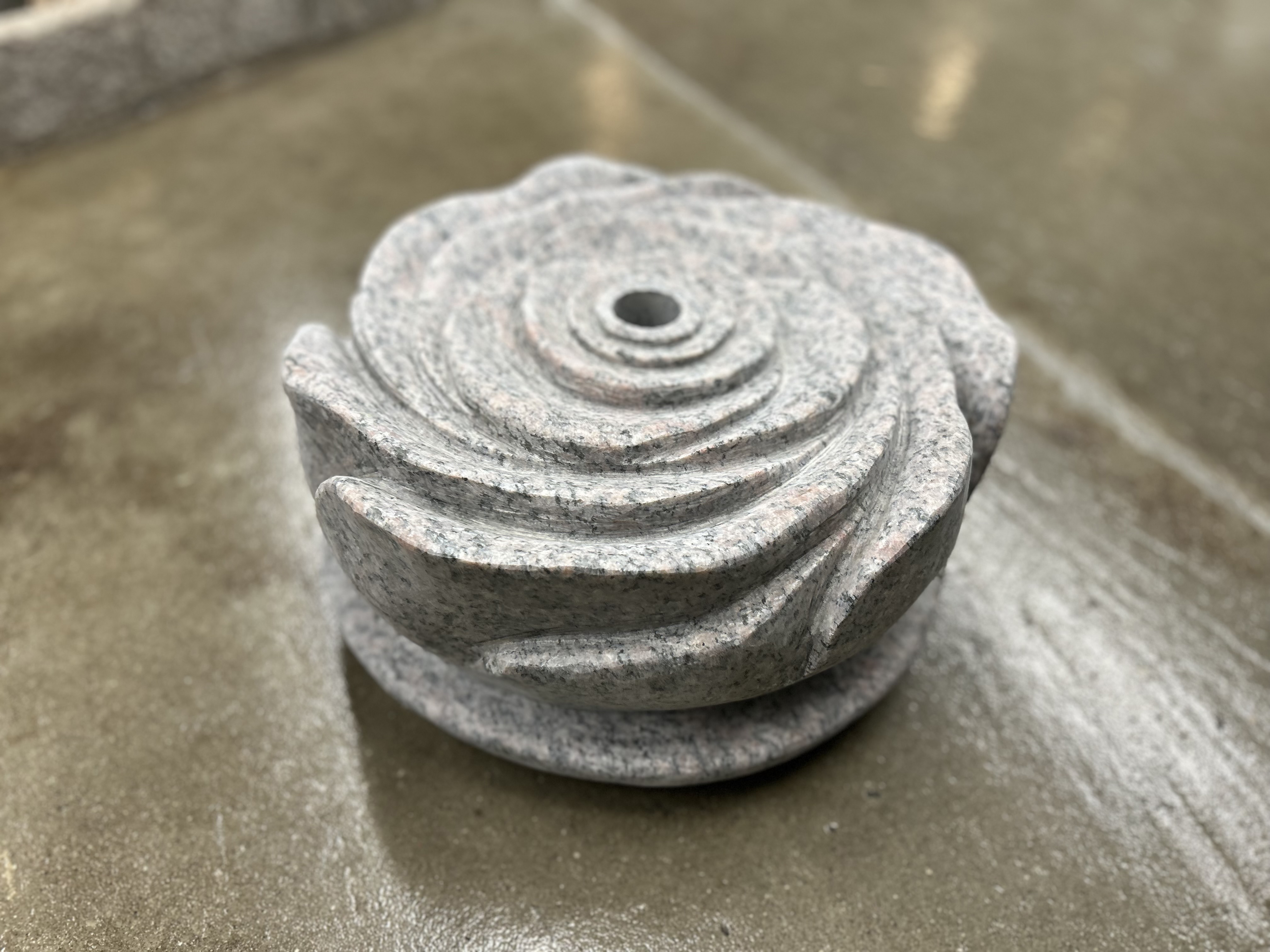 Vandsten Rose i rød granit. Stenen er rund og har folder som en rose, så vandet risler ned af kanterne. Hullet til lys har en diameter på ca. 3,5 cm