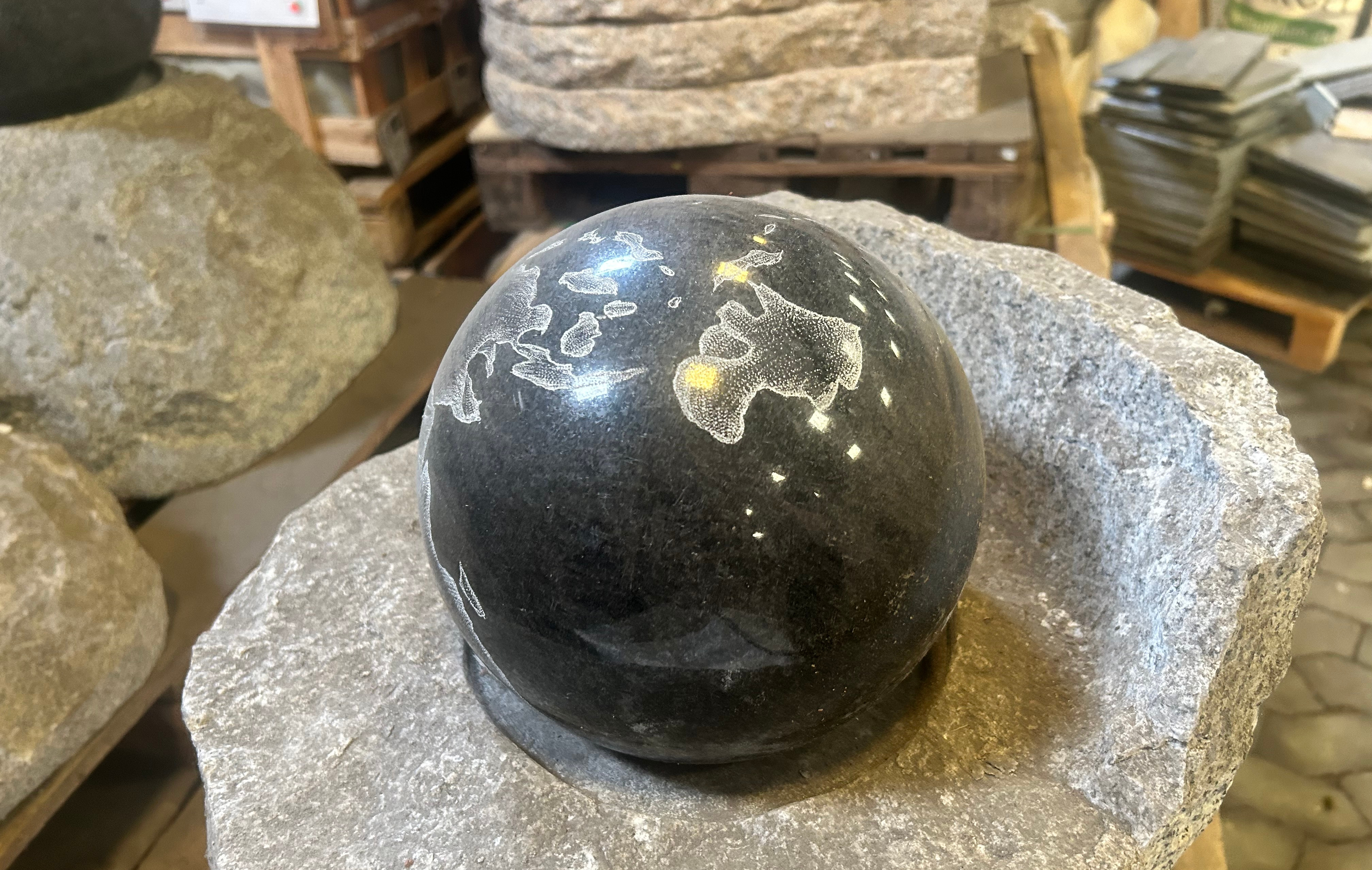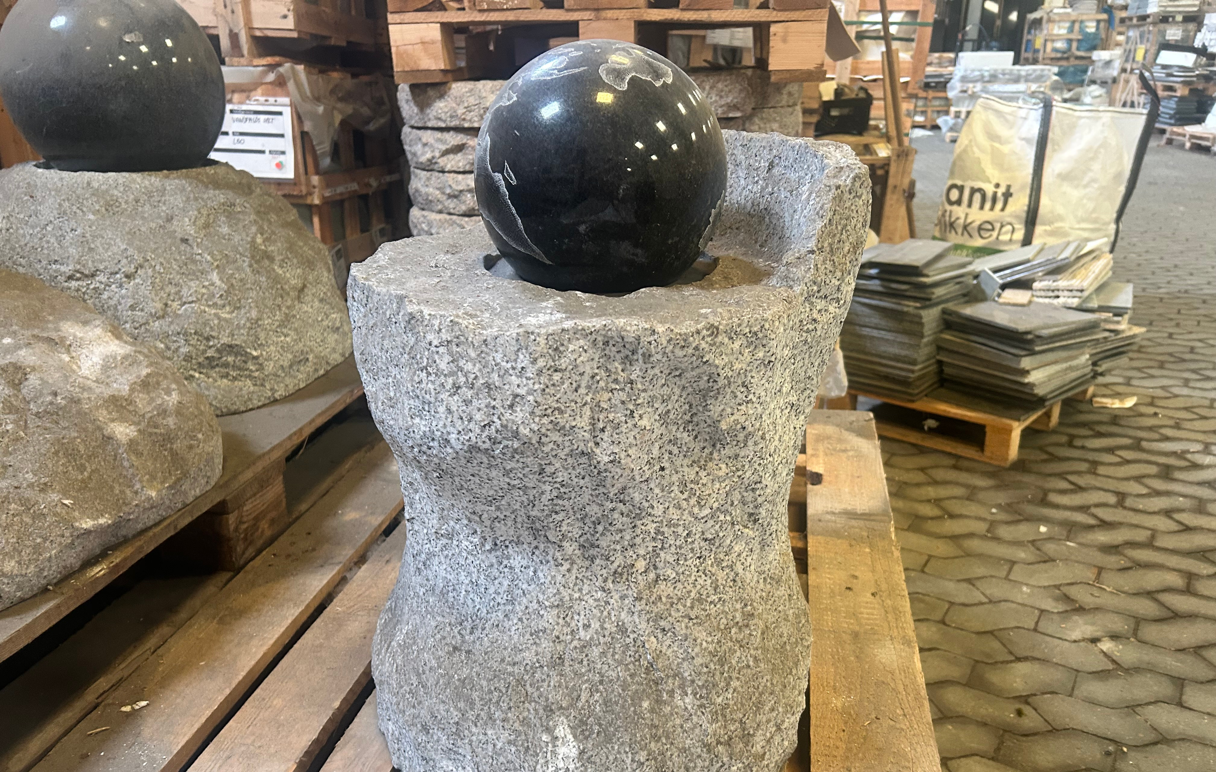 Vandsten i lysgrå granit med poleret roterende kugle med globus.