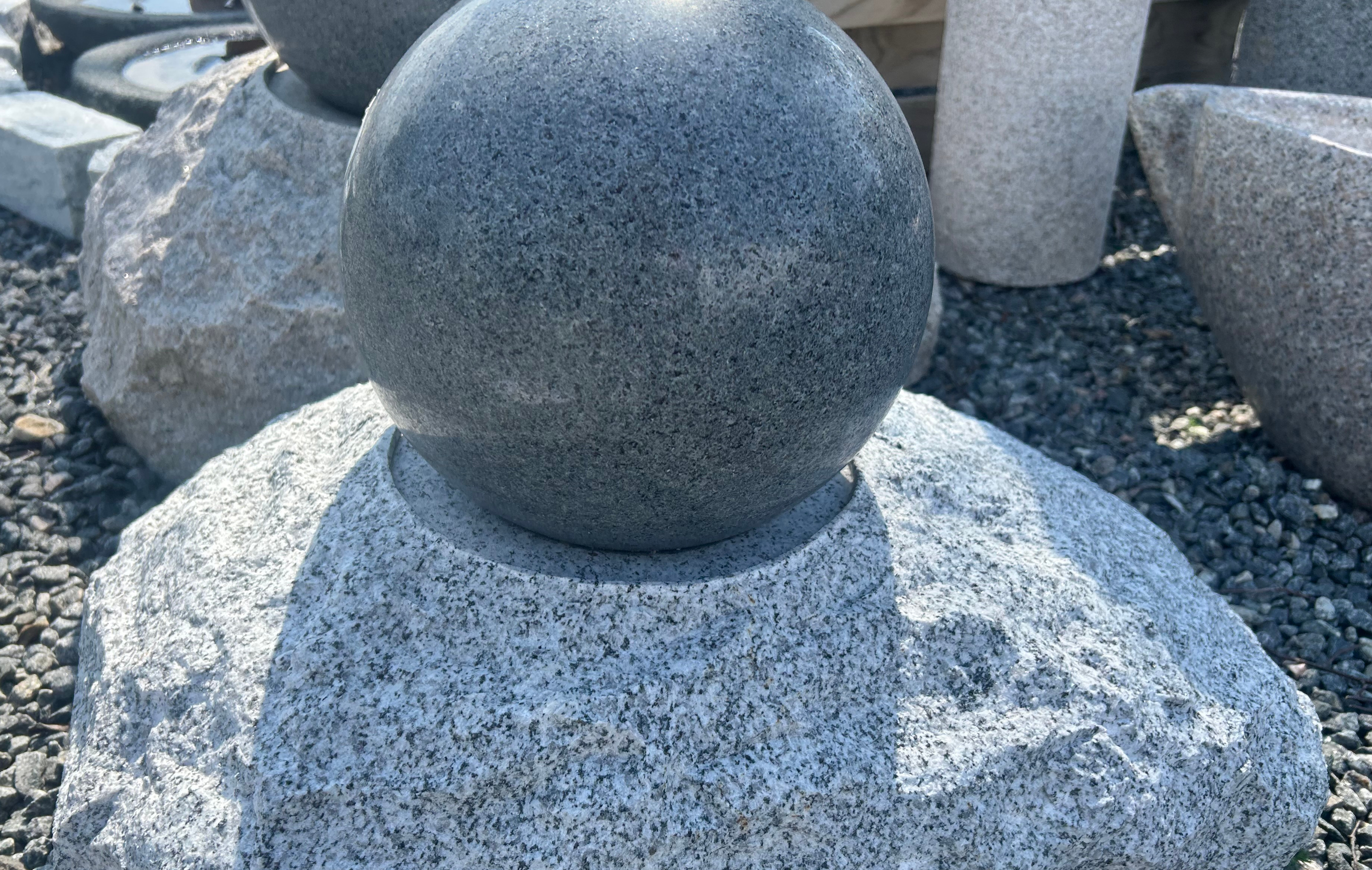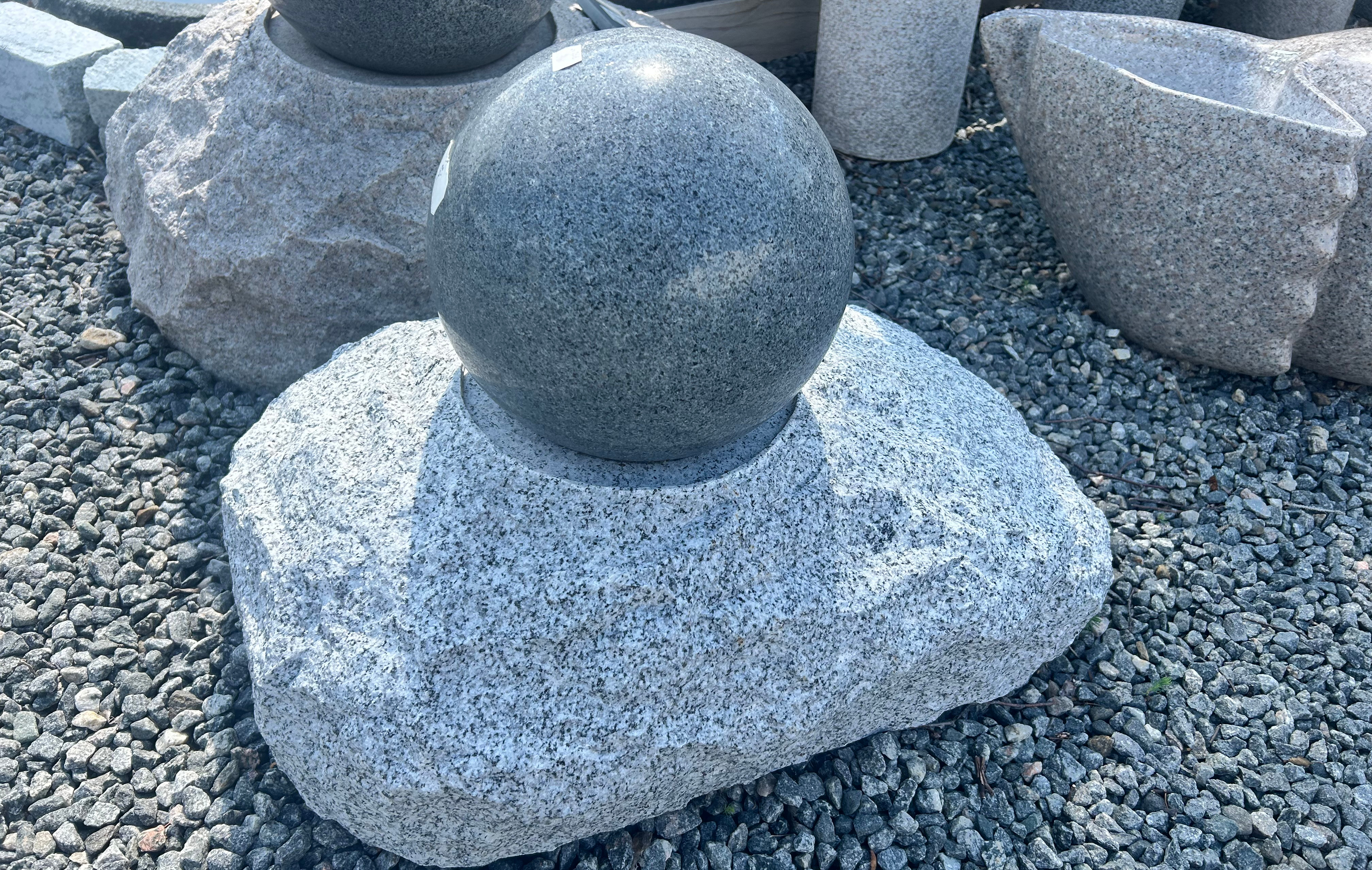 Vandsten i lysgrå granit med gråsort poleret roterende kugle.