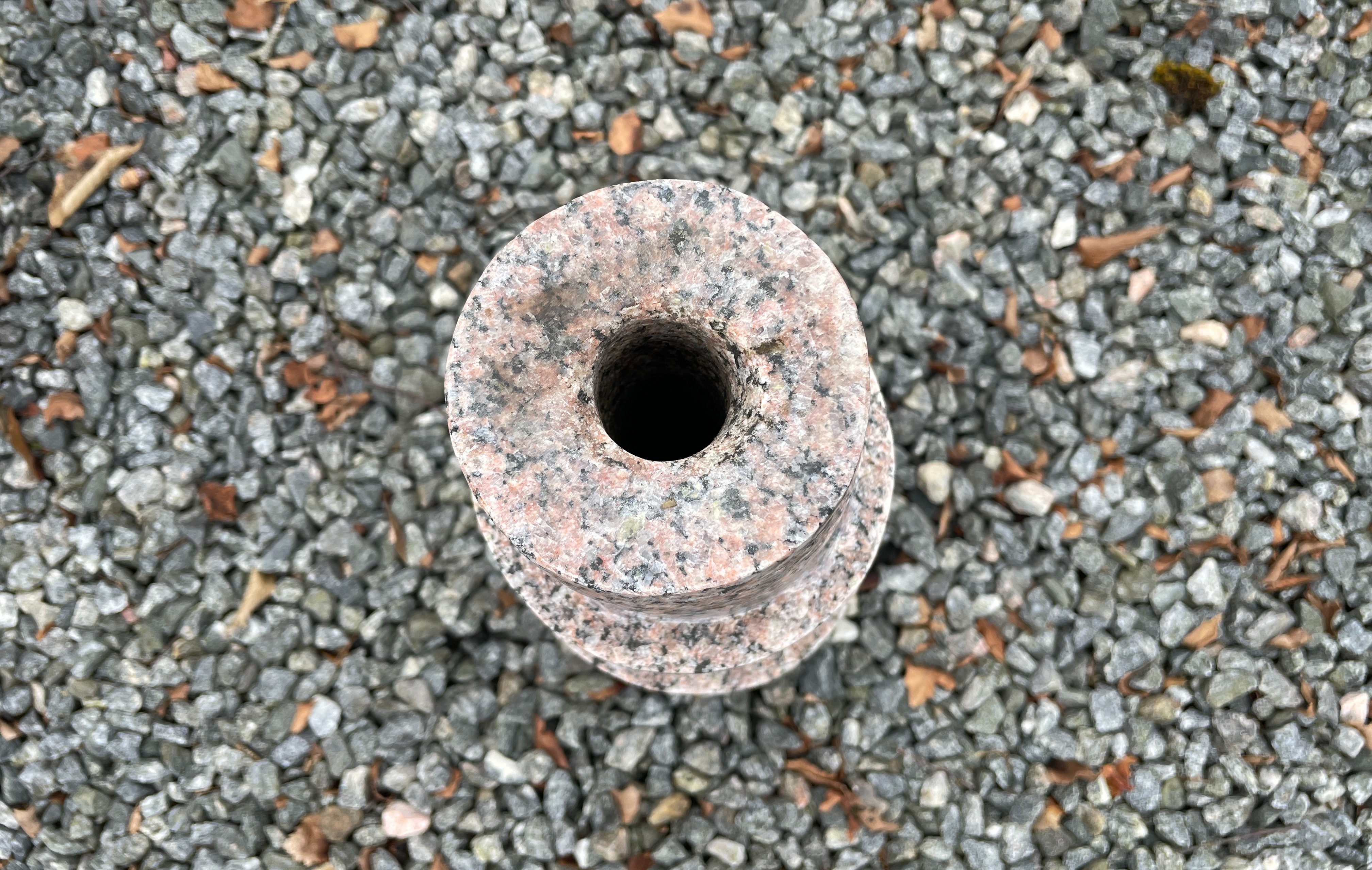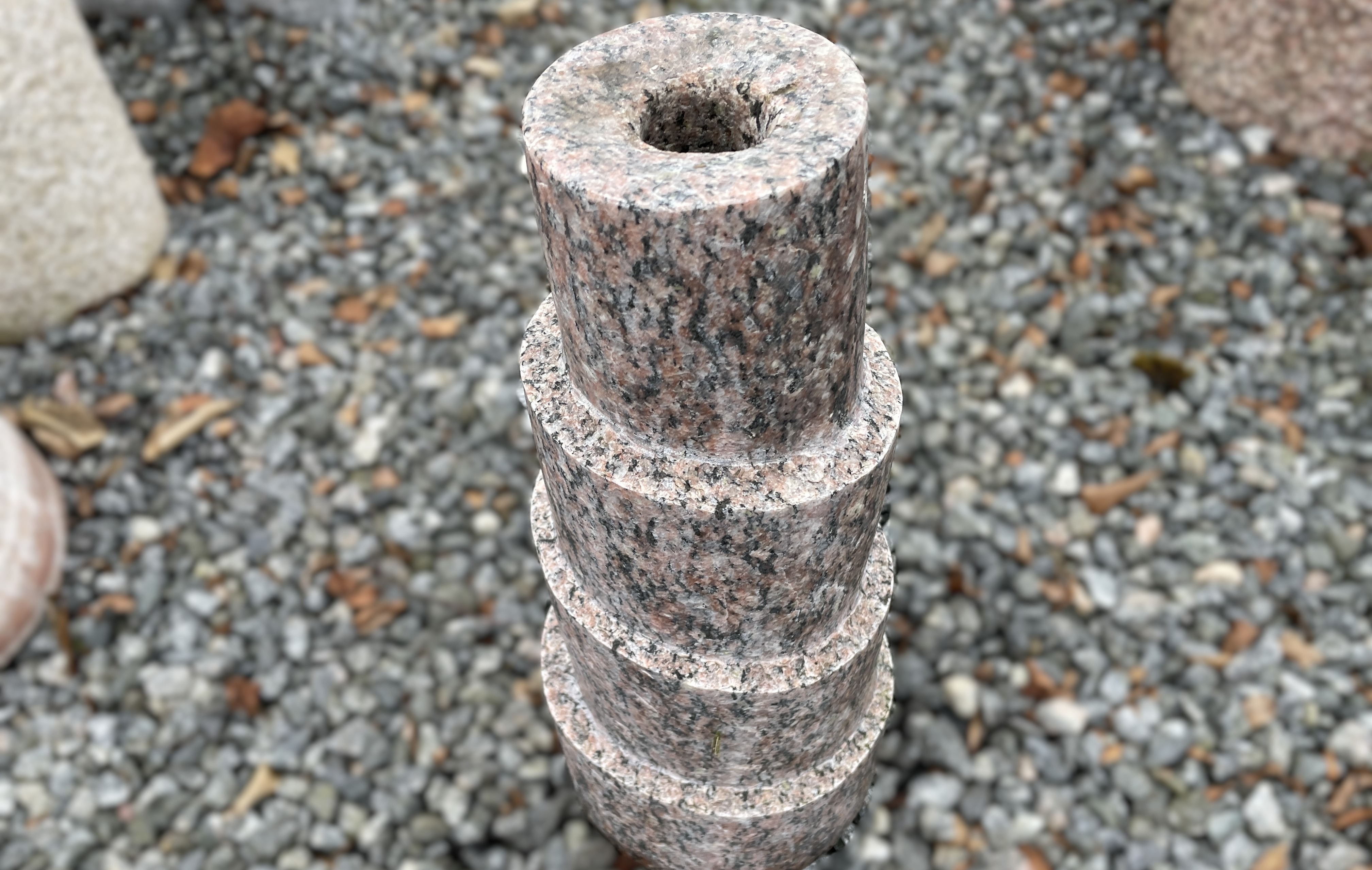 Vandsten kaldet skorsten. Vandstenen er laver i rødlig granit, med en poleret overflade der frembringer granittens varierende farvespil.