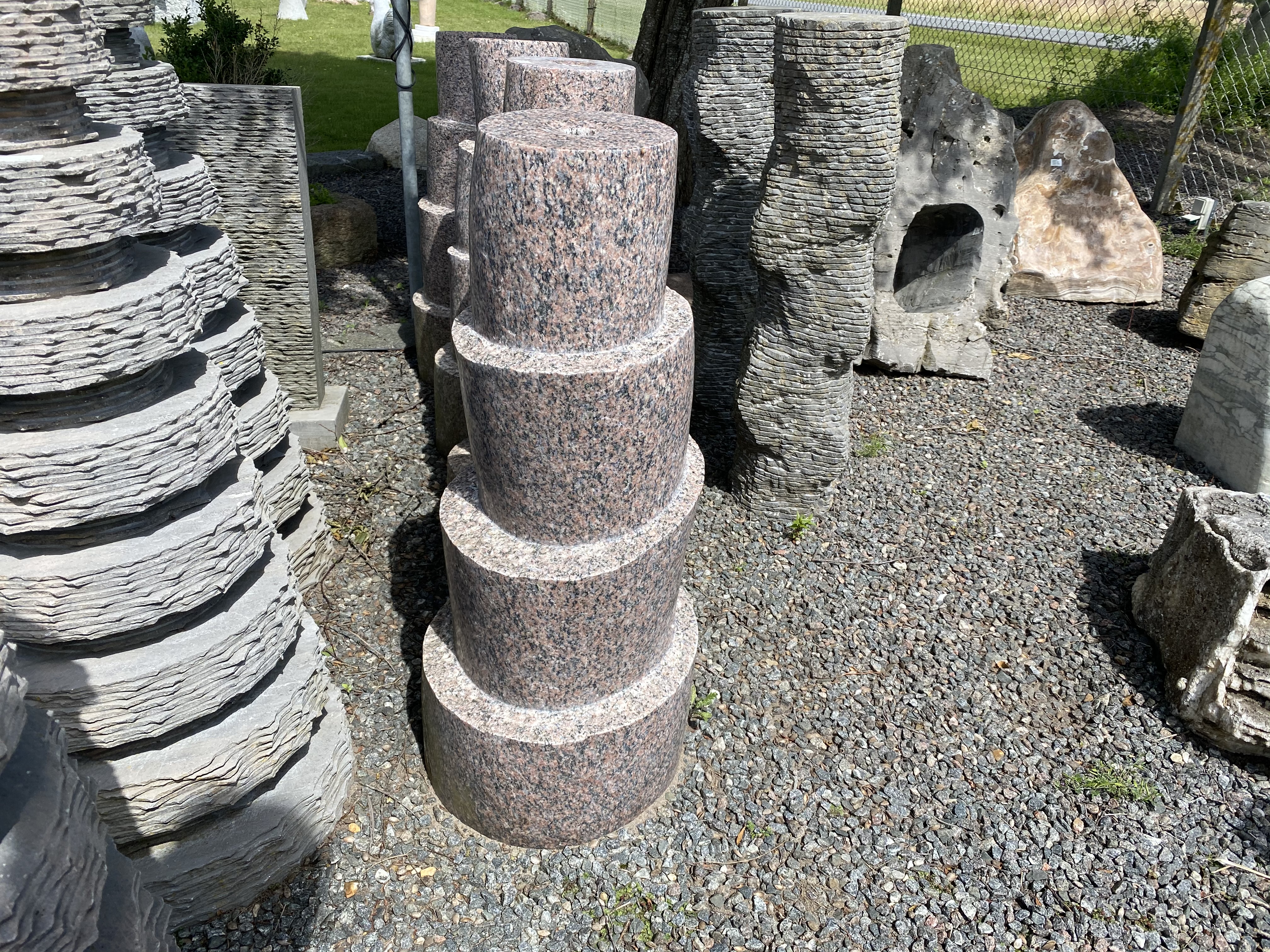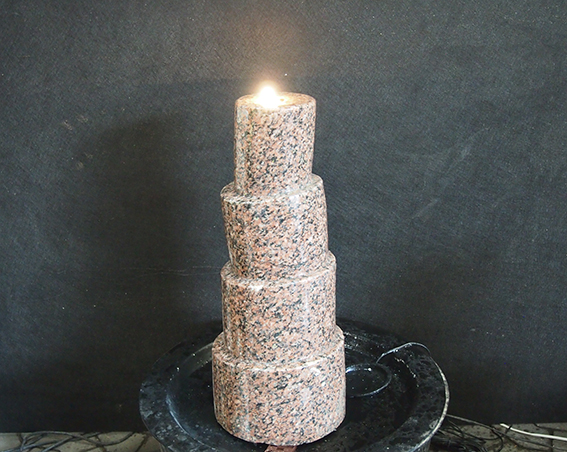 Løs vandsten i rød poleret granit. Stenen er som en skæv skorsten der stikker op i luften og pryder i haven. Vandet løber stille og roligt ned af den polerede overflade og risler ned over kanterne. Jo mere tryk på pumpen jo mere rislen vil man få. Vandstenen kræver en mellem pumpe med halogen hvis lys ønskes.