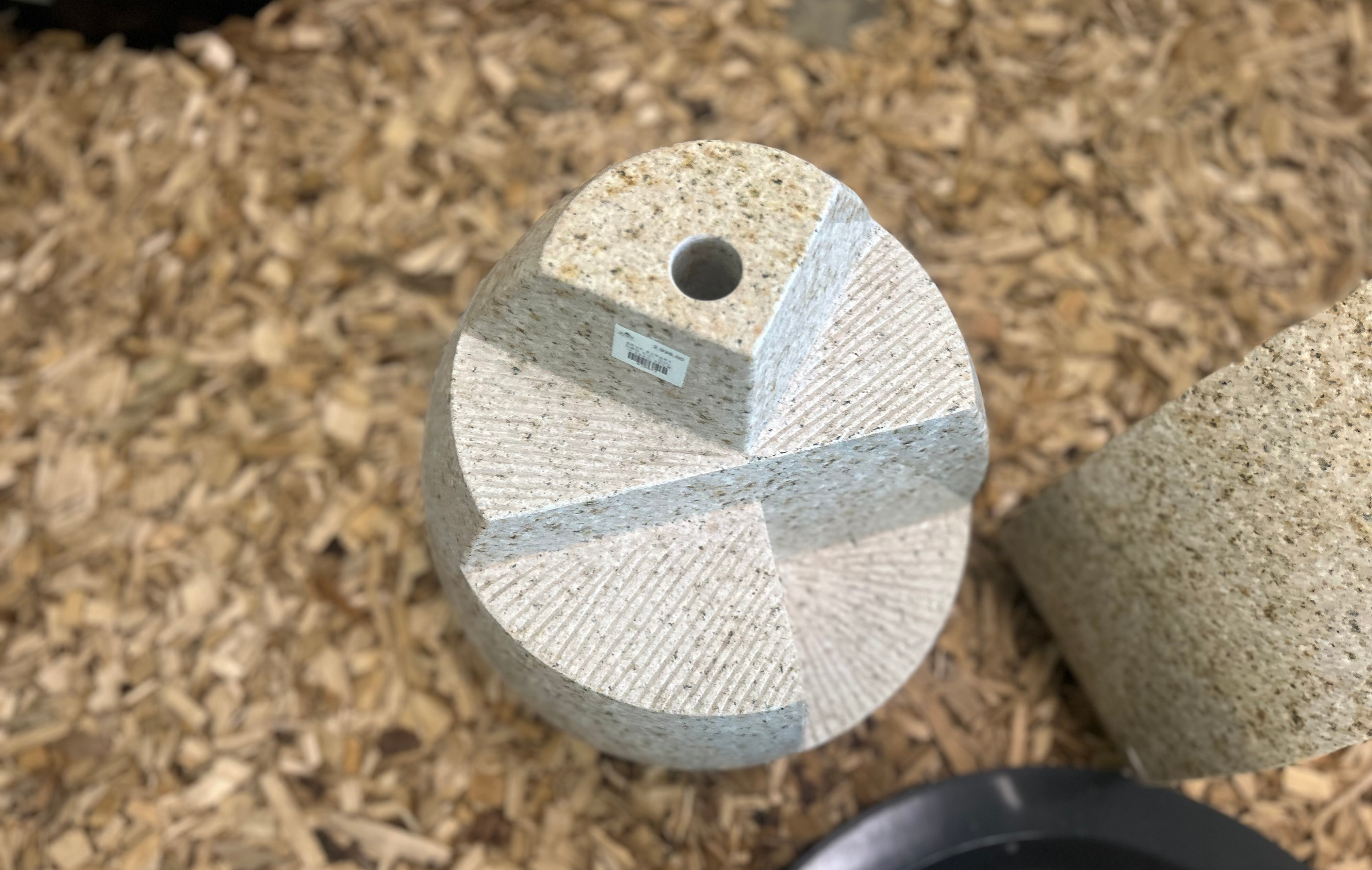 Vandsten lavet i granit, udformet som en strakt nød i gul granit med polerede overflader.