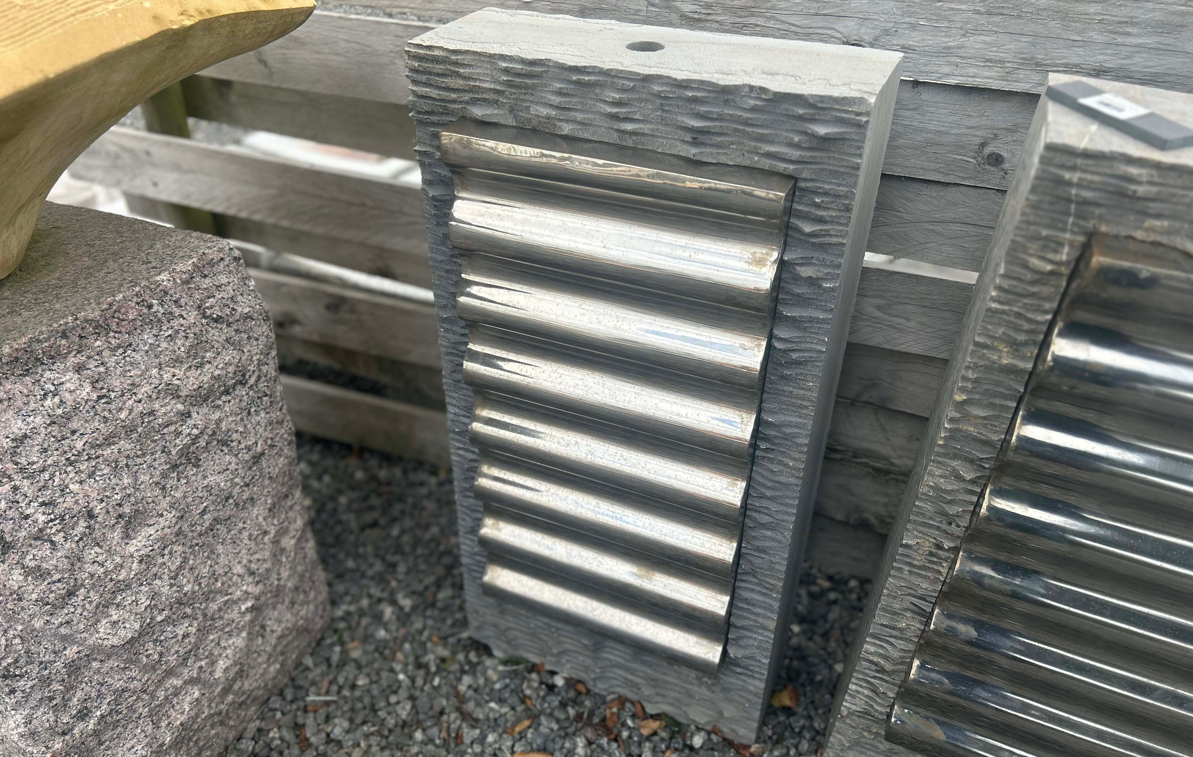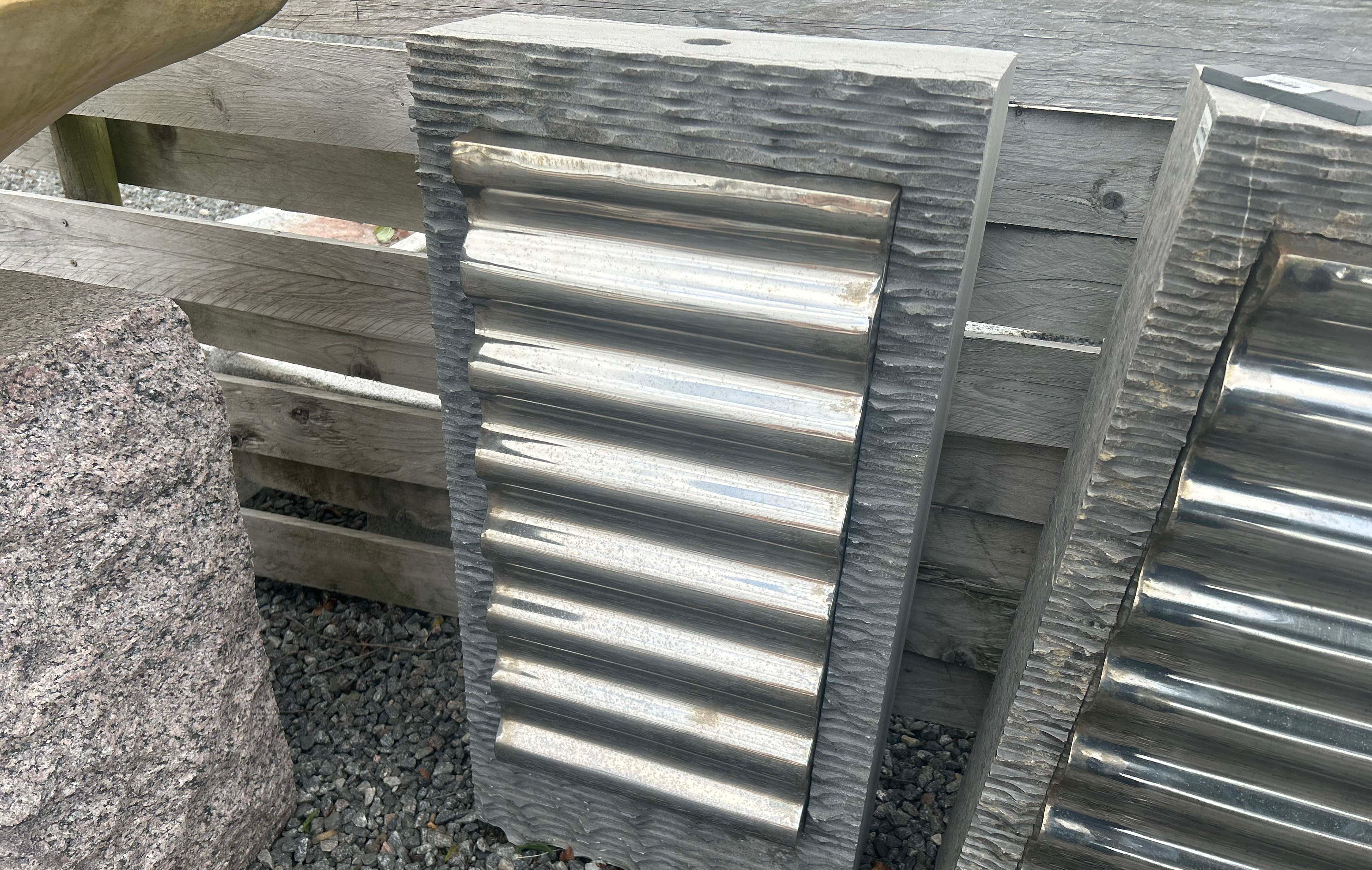 Vandsten vandfald med stål detaljer udført i mørkegrå limestone.