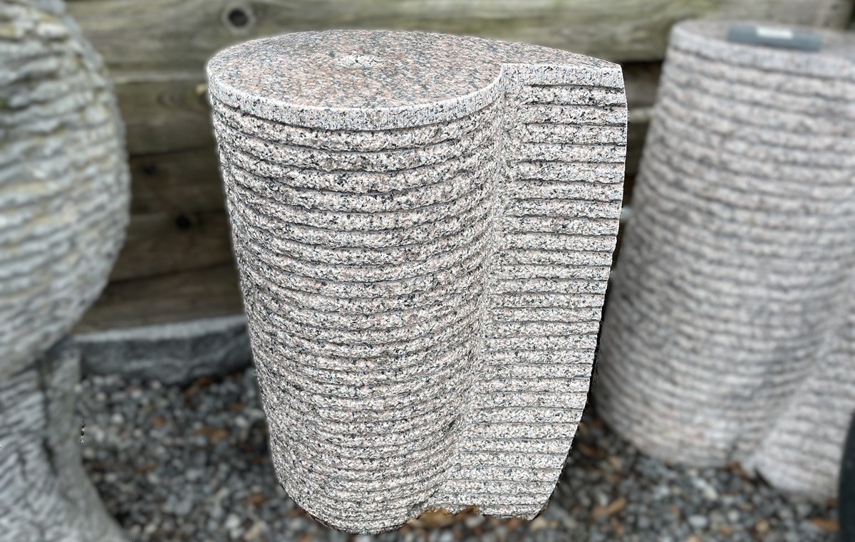Vandsten lavet i rosa granit, med detaljer i form af riller der omkranser vandstenen og tilføjer et spændende og rustikt udtryk.